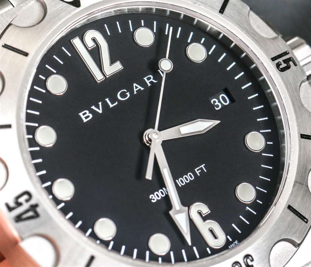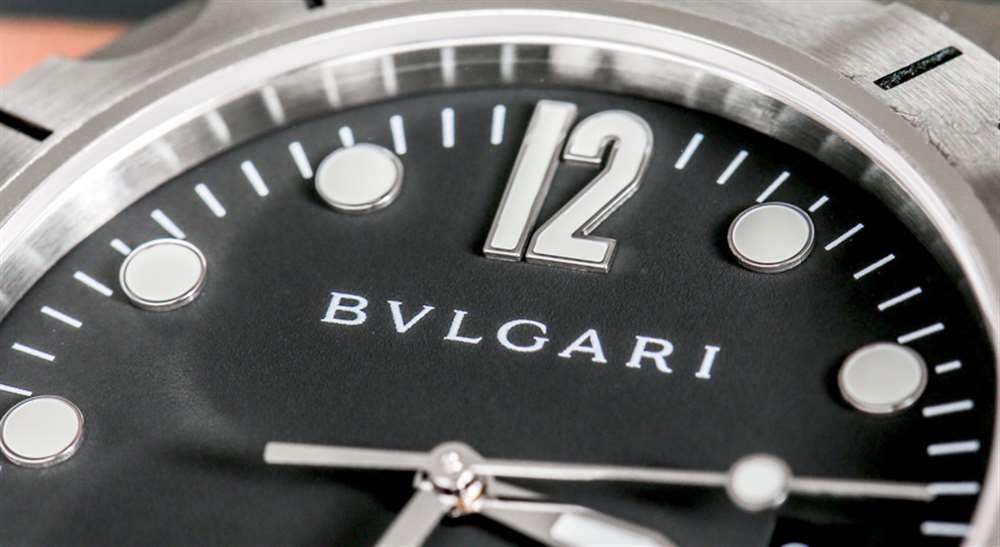寶格麗真的淡化了表盤文字,只包含品牌名稱和防水信息。手表收藏家往往對表盤上的文字非常挑剔——這往往是不必要的。將新一代 Bulgari Diagono Scuba 與舊型號進行比較,您會看到更少的文字。表盤符合意大利風格,并非純粹的功利主義,而是與任何意大利設計的物品一樣的包豪斯風格。易讀性得益于時針和分針的形狀不同,阿拉伯數字 12 點和 6 點鐘的時標有助于很好地定位表盤。日期指示窗位于 3 點鐘位置,既實用又不會過分突出。