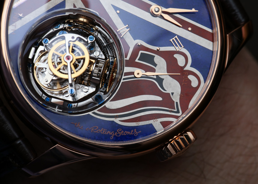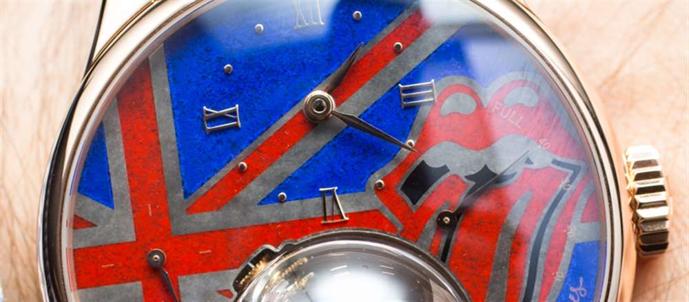 帶有滾石樂隊的標志、張開嘴巴的標志和英國國旗,每個表盤都是手工琺瑯,在指針和索引標記上涂有金色貼花。如果您真的很喜歡滾石樂隊,那肯定是一個很酷的概念。