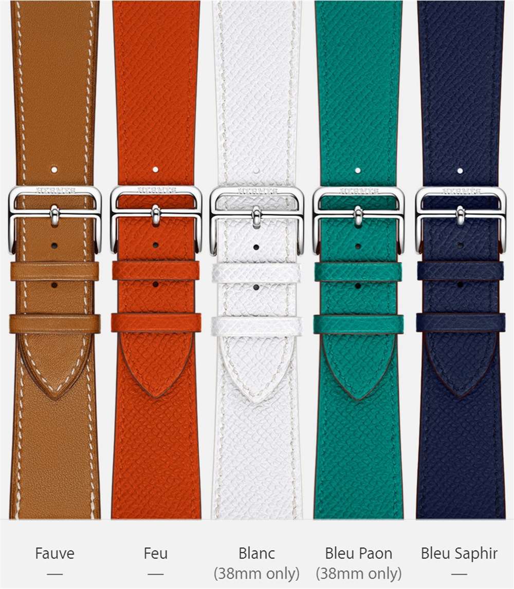 Apple Watch Hermes 表帶共有三個(gè)版本,包括 Single Tour(38 毫米和 42 毫米版本)、Double Tour(僅限 38 毫米)和 Cuff(僅限 42 毫米)。所有愛(ài)馬仕原版表帶顏色版本以及新顏色都可以單獨(dú)購(gòu)買,它們包括 Fauve Barenia(棕褐色)、Noir(黑色)、Capucine(紅色)、Bleu Jean(淺藍(lán)色)、Etain(灰色)、Blanc(白色)和 Feu(橙色)。Apple Watch 的三種不同愛(ài)馬仕表帶共有七種顏色可供選擇。