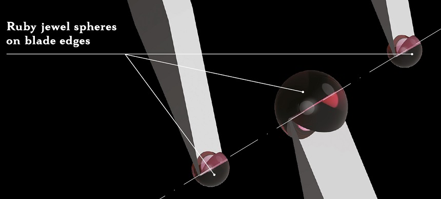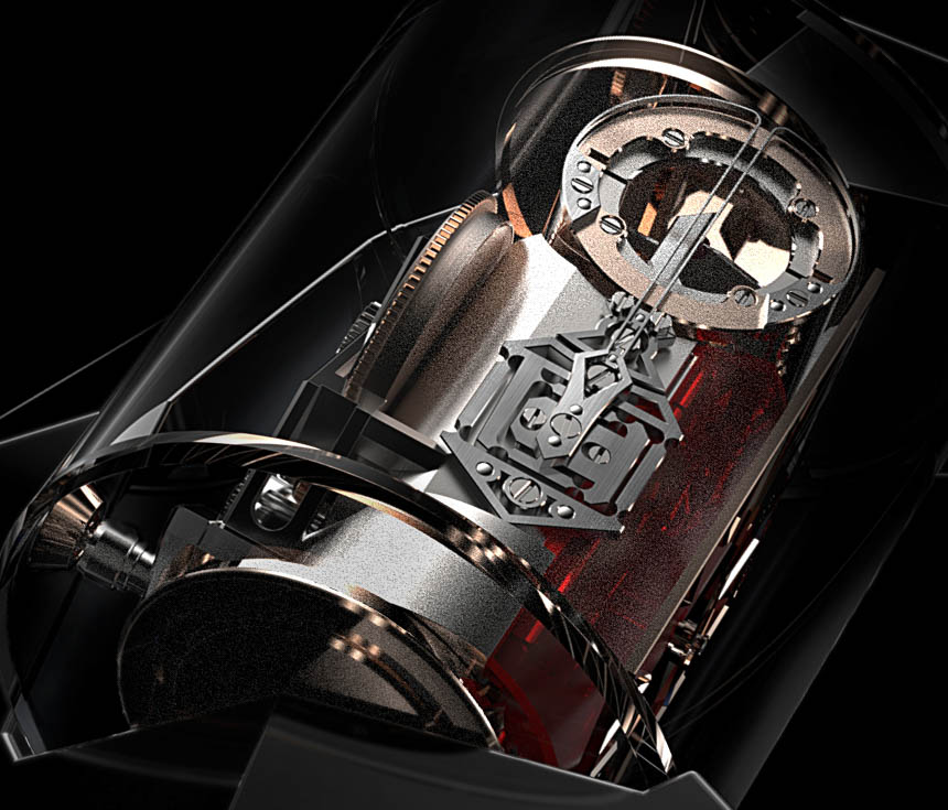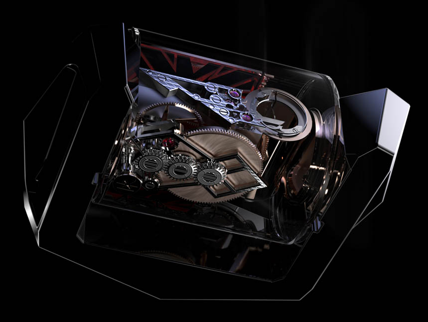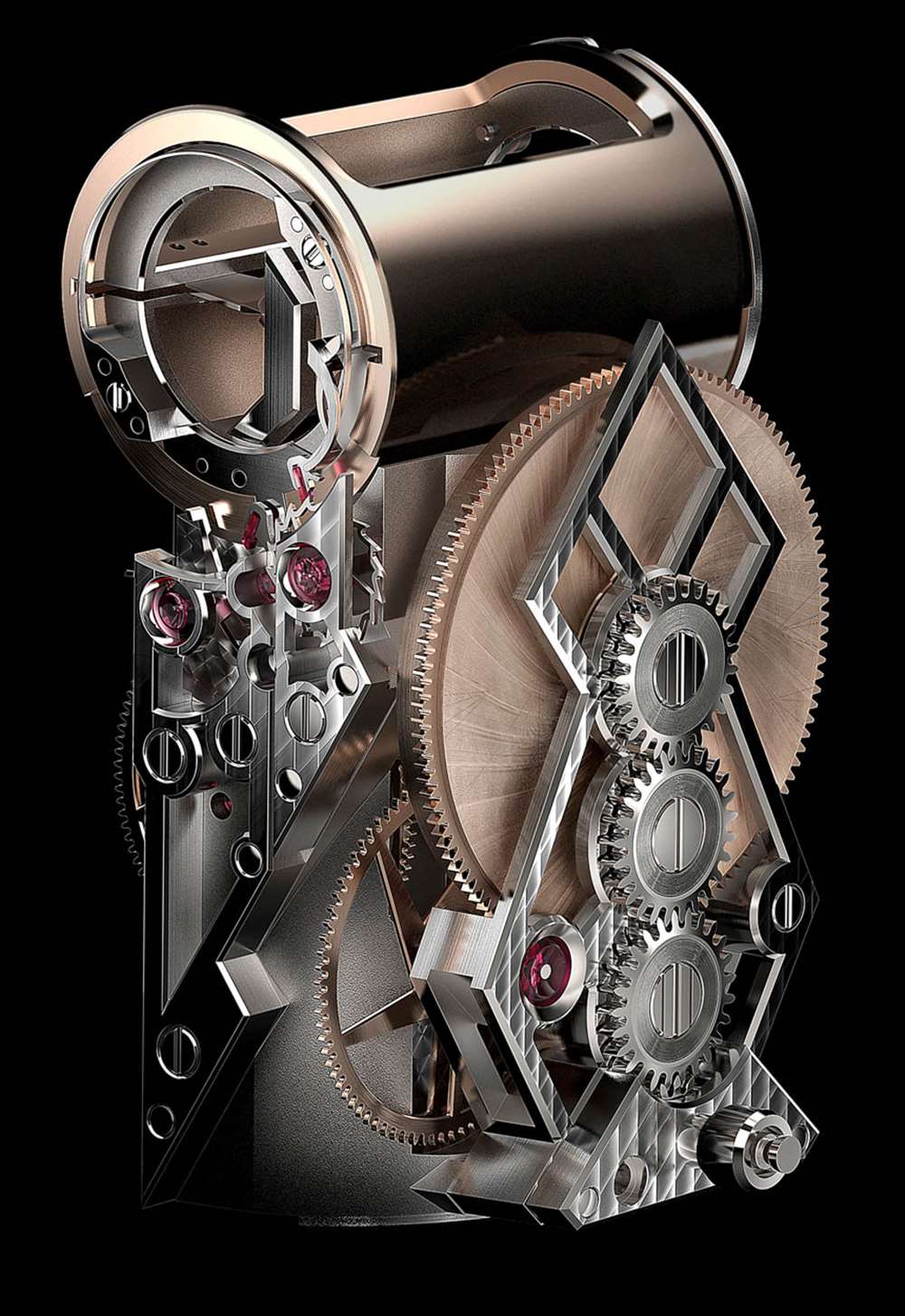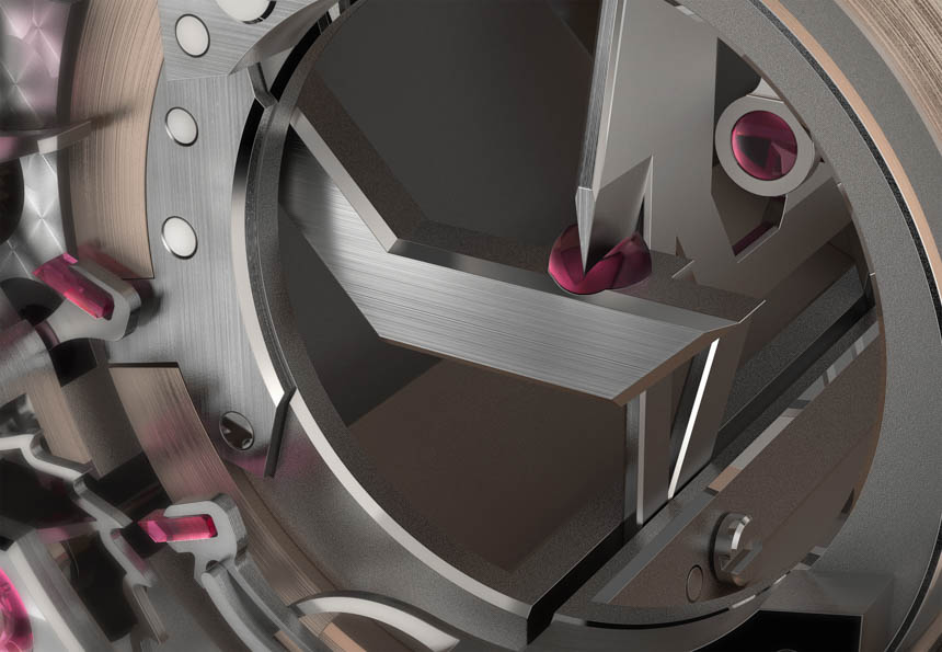一個看起來像剃須刀的組件有三個“刀片”,尖端鑲有 PAC-MAN 風(fēng)格切割的合成紅寶石球體。在球體的這些切割空間中,刀片前后移動,連接到一個圓柱體以模擬擺輪的擺動拱形。與傳統(tǒng)擺輪相比,您可以看到振幅有多短。此外,連接到葉片諧振器的是一個擒縱系統(tǒng),該系統(tǒng)利用其直接脈沖系統(tǒng)模擬天文鐘擒縱系統(tǒng)的優(yōu)勢。直到最近幾年,我們才開始在腕表中看到傳統(tǒng)的棘爪式擒縱機構(gòu)??梢哉f,天文鐘式擒縱機構(gòu)對于總體計時結(jié)果來說更好,但很難設(shè)計到腕表中,因為它們對運動和震動非常敏感。