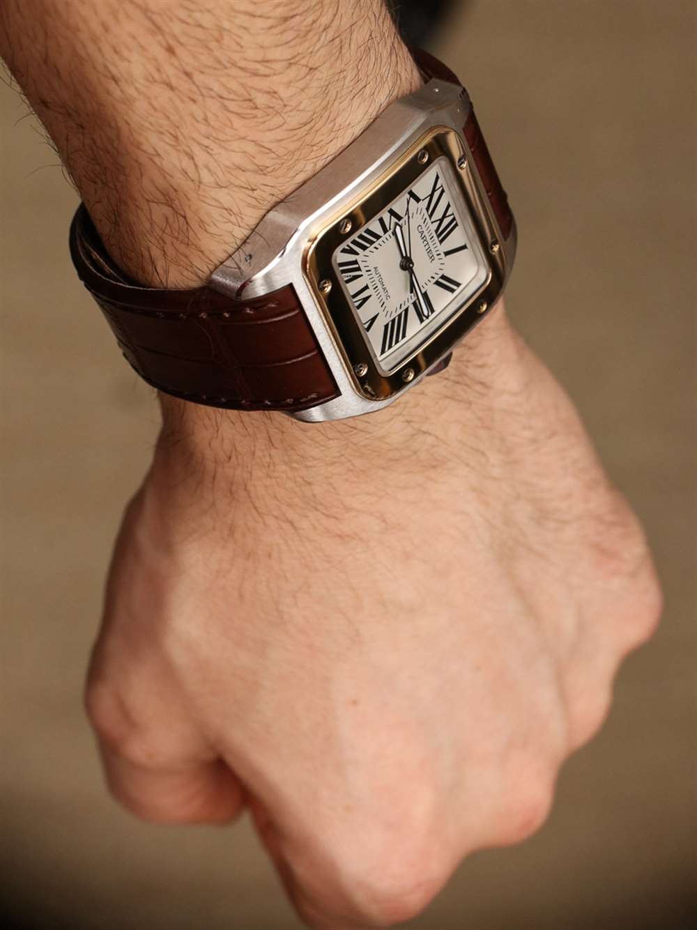 然而,上述趨勢并不普遍,合適的正方形或長方形手表看起來會很棒。卡地亞桑托斯 (Cartier Santos) 系列就是其中之一,而它為何能在手腕上發(fā)揮作用則難以解釋。就像許多運作良好的美學一樣,大腦并不總是能很好地翻譯眼睛所感知的內容。我花了好幾天時間看著手腕上的 Cartier Santos 100,試圖思考“為什么這款方形手表能用,而其他的卻不行?”