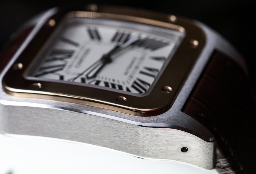 卡地亞桑托斯 100 型號 W20073X8 的基礎型號采用全鋼黑色表帶,而型號 W20072X7 則配備棕色鱷魚皮表帶和 18k 黃金表圈。它也恰好是我最喜歡的。表圈無疑是 Santos 100 系列中最獨特的元素,而且是您在 Santos-Dumont 上看不到的元素。卡地亞過去當然也生產(chǎn)過其他帶有“旋入式”方形表圈的小型 Santos 型號——這種外觀已經(jīng)延續(xù)到該品牌的許多珠寶系列中,例如非常流行的 LOVE 手鐲式手鐲,它似乎有用螺絲擰緊它……實際上是用螺絲固定在手腕上的。
