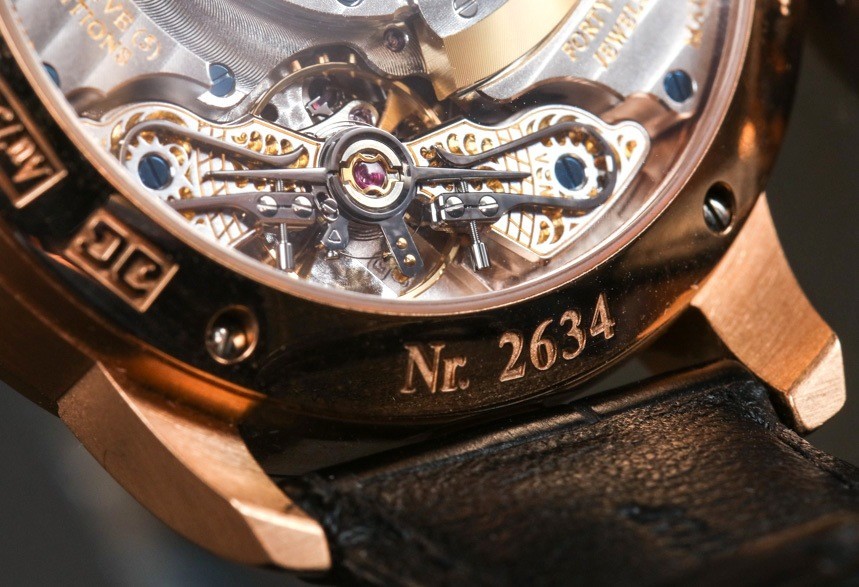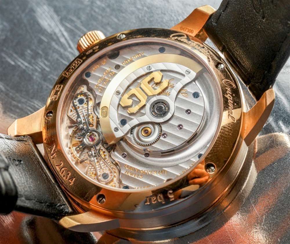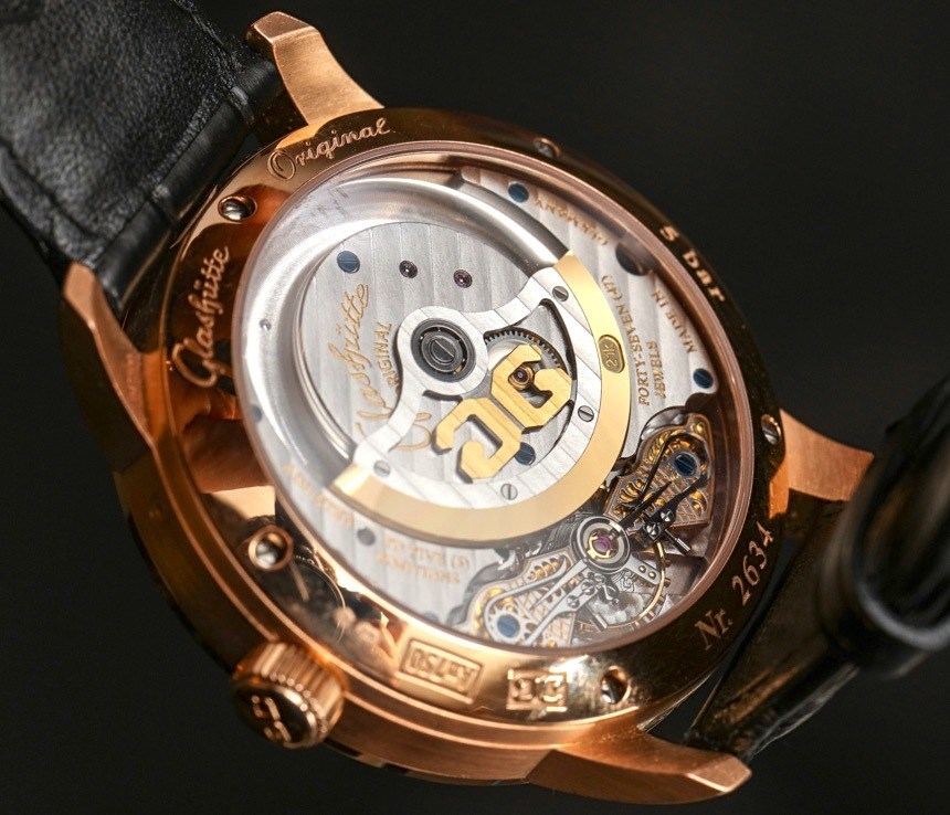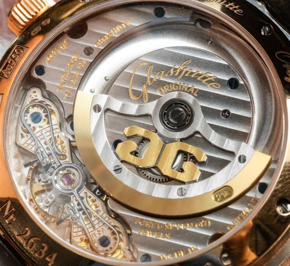 “PanoMatic”在一定程度上暗示這款腕表搭載自動上鏈機芯——此處為格拉蘇蒂原創自制機芯 90-02。在外觀大同小異的手表機芯領域,90-02 有一些顯著的視覺差異,例如“3/4 自動轉子”尺寸以及擺輪橋板上獨特的雕刻風格。這是格拉蘇蒂地區(以及整個薩克森州,包括德累斯頓生產的手表)的一種地方風味,高級手表帶有手工雕刻的擺輪夾板和橋板。很難看到雕刻的細節,但它們看起來很獨特,不是超級經典,而是似乎混合了一些美學風格。