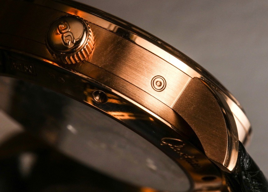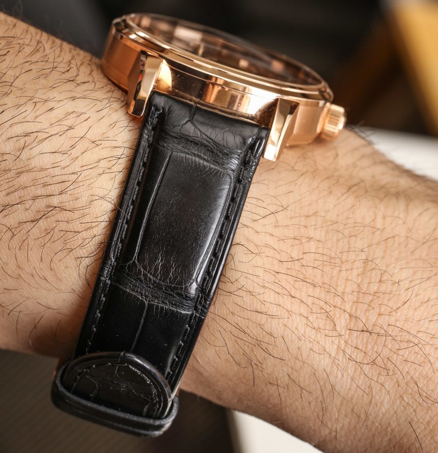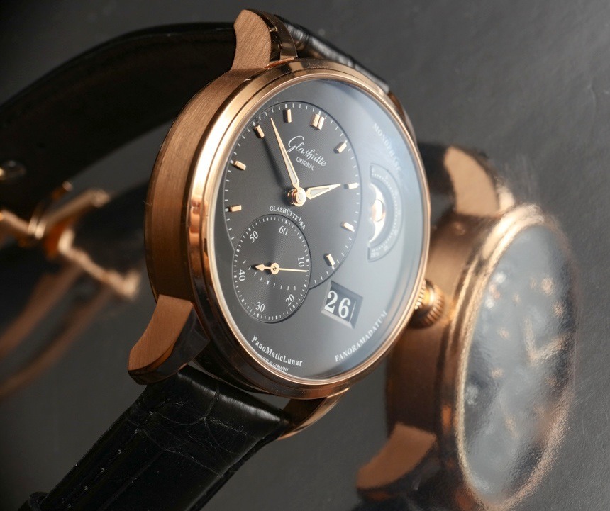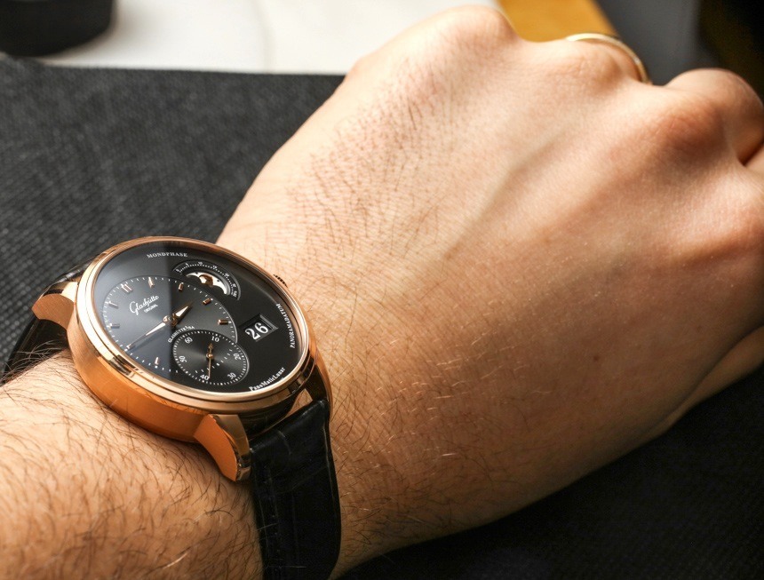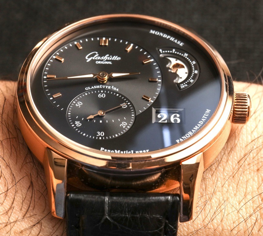 在手腕上,Glashütte Original PanoMaticLunar 的尺寸更為傳統,寬度為 40 毫米——此處采用 18k 紅金打造,看起來十分光滑。就像我說的,這款手表也有鋼制的。Glashütte Original PanoMaticLunar 的厚度為 12.7 毫米,考慮到機芯的尺寸,這是可以理解的,但它比正裝表更厚。話雖如此,對于那些覺得 40 毫米寬的尺寸不夠大的人來說,近 13 毫米的厚度確實有助于讓手表感覺更大。我也很欣賞,雖然它不是運動手表,但 50 米的防水性能優于您在許多其他類似手表中看到的 30 米防水性能。