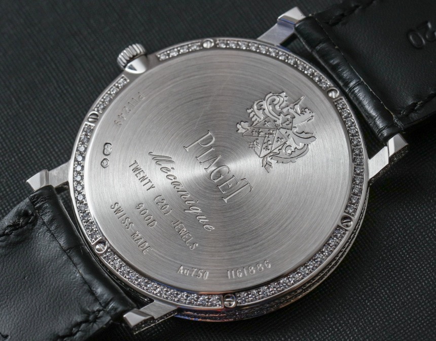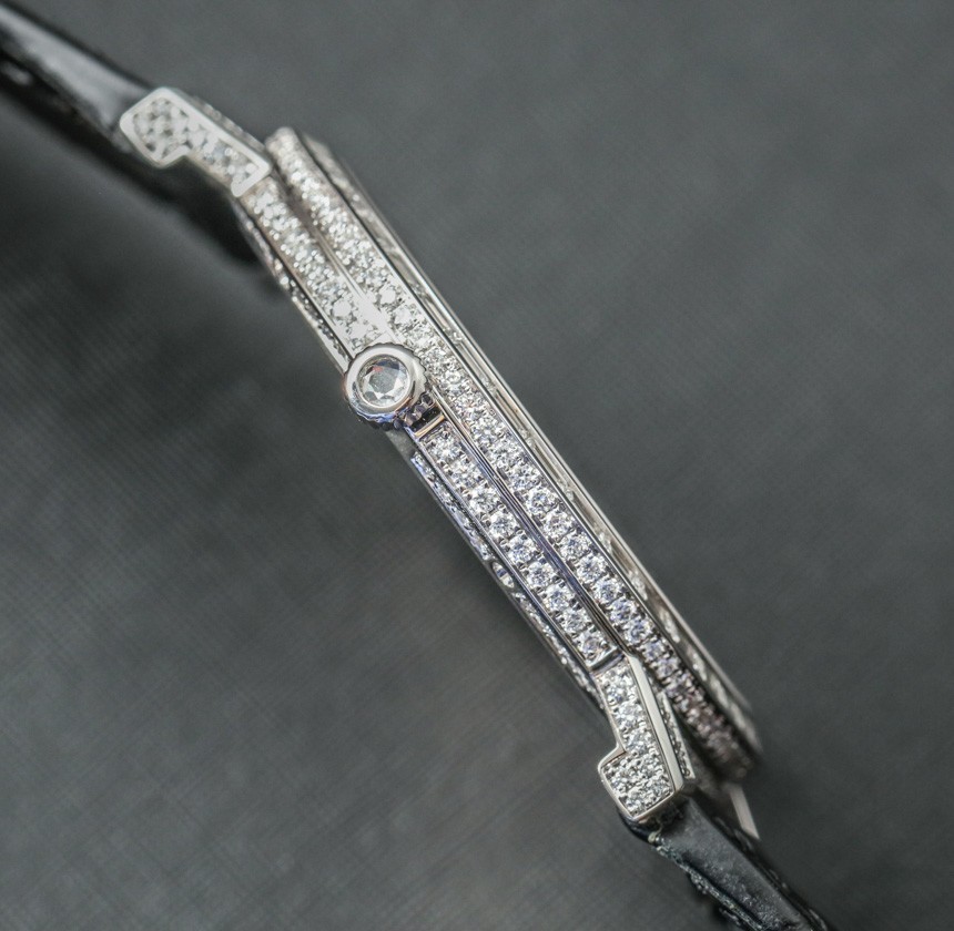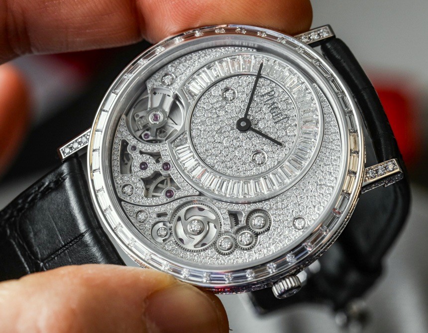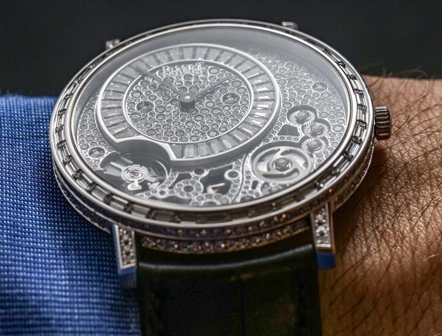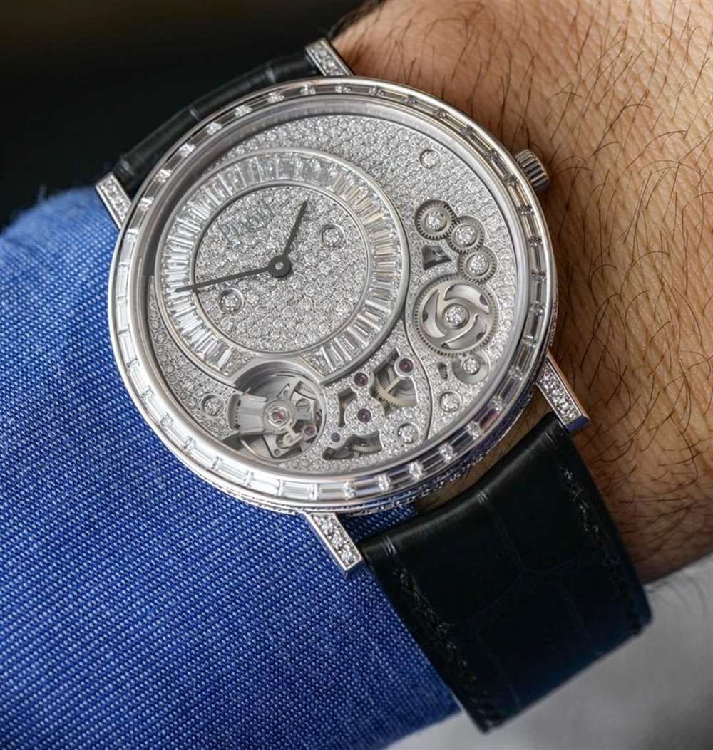 Altiplano 900D 的寬度為 38 毫米,非常適合作為正裝手表佩戴。黑色指針非常清晰易讀,特別是因為時間表盤以長方形切割鉆石環突出顯示。我會喜歡小時刻度的分界線,但對于這樣的手表,為什么要抱怨這樣的事情呢?900D 表殼和表盤共鑲嵌 5.77 克拉鉆石。