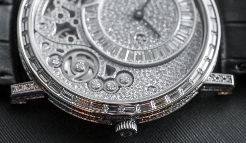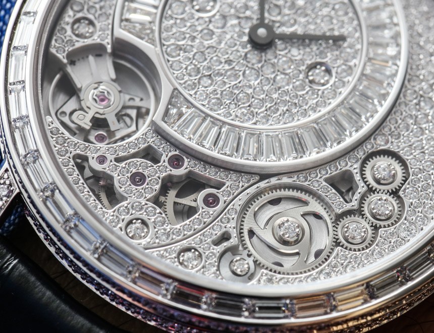 當然,如果表盤未鑲嵌鉆石,它就不會是 900D(“D”代表鉆石!)。這里的訣竅是,表盤也主要是機芯,當時有一個偏心表盤部分。表盤或機芯均鑲嵌長方形或圓形切割鉆石。甚至螺絲都鑲有鉆石,即使您不是寶石愛好者,您也必須欣賞將世界上最薄的機械表轉變為最薄的高級珠寶手動上鏈機械表的巧妙努力。