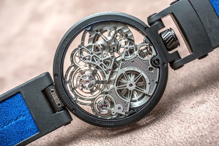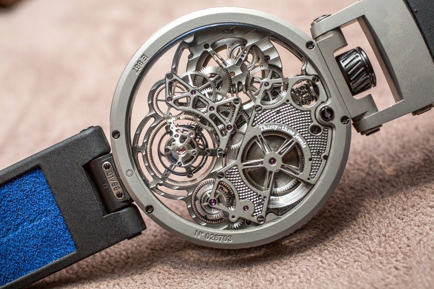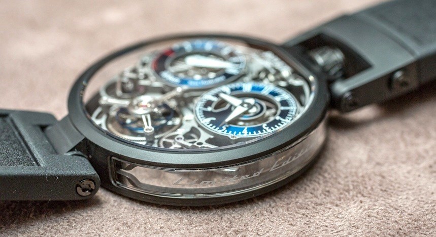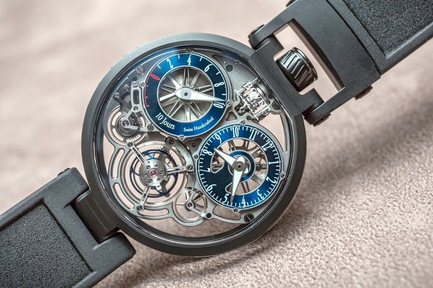 Bovet Pininfarina OttantaSei 10-Day Tourbillon 手表也很輕——尤其是兩個鈦金屬版本。我必須承認,考慮到 12 點鐘位置的“蝴蝶結式”表冠位置,它佩戴起來非常時尚,但并不不舒服。Bovet 聲稱即使是黃金表殼也僅重 51.66 克(不含表帶)。整個設計的重點是讓 Bovet Pininfarina OttantaSei 10 天陀飛輪看起來輕盈……輕盈。