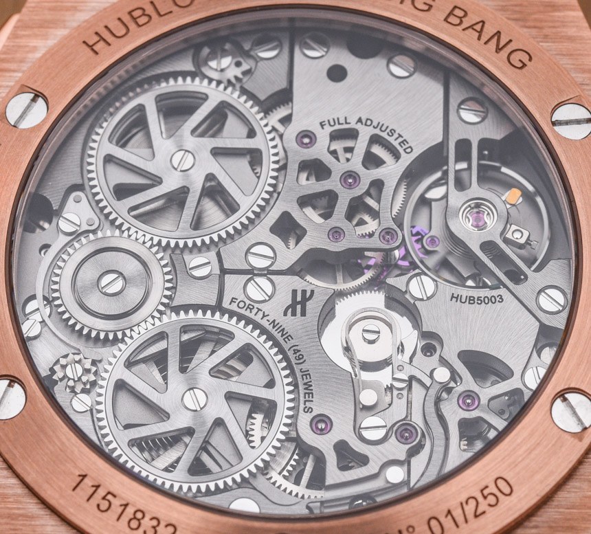 HUB5003機芯采用硅質擒縱系統,動力儲存72小時,包括帶24小時指示的時間、用于設置未來24小時鬧鐘時間的24小時表盤,以及一個警報并發癥的開/關開關。此外,表盤由半透明材料(幾層彩色藍寶石水晶)制成,即使 Hublot Big Bang Alarm Repeater 沒有所謂的鏤空表盤,也可以瞥見下面的機芯。