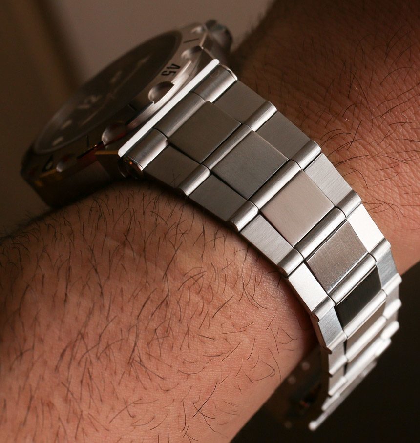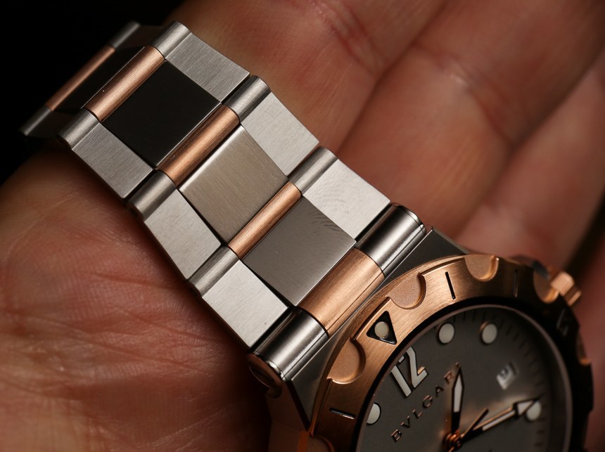 Buglari Diagono Scuba 腕表表殼寬 41 毫米,當然還有一塊鍍增透膜的藍寶石水晶表鏡。發光體在指針和時標上看起來也很不錯。與所有 Diagono 表殼一樣,Bulgari Diagono Scuba 佩戴起來非常舒適,表耳系統使表殼非常適合大多數手腕。表耳使用一個鉸接式樞軸點,該樞軸點延伸至手鏈中的每個鏈節。這是一個很酷的系統,可以帶來很多穿著舒適感和時尚感。話雖如此,Bulgari Diagono Scuba 手鏈的設計并不適合所有人,因為 Bulgari 一直追求一個非常具體的美學主題,并不試圖吸引所有人。如上所述,我是 Diagono 家族審美的粉絲,但如果你不是,我也能理解。