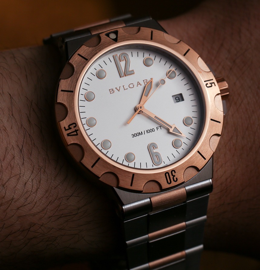 Bulgari Diagono Scuba 雙色調 18k 玫瑰金和精鋼搭配白色表盤,以一款帥氣、更成熟的時計吸引更多生活方式的觀眾。表殼足夠薄,可以套在袖子下,但手表的整體外觀和感覺仍然非常運動和夏日。雖然我非常喜歡這個版本的表盤,但日期窗口的簡潔風格在這里看起來不像黑色表盤版本那么合適。我覺得日期窗口周圍的某種類型的框架(或類似的東西)可能是個好主意。