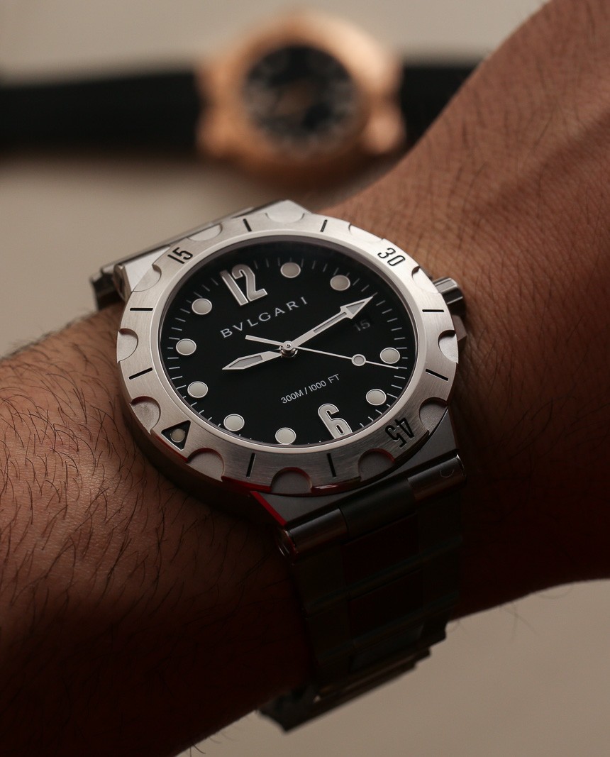 2015 年,Bulgari Diagono Scuba 推出了幾個版本,包括精鋼和 18k 玫瑰金型號,以及雙色鋼和金型號。有黑色和白色表盤選項,當然還有橡膠表帶或 Diagono 風格的金屬表鏈。如果您想要完整的“工具表”型號,那么手鏈上帶有黑色表盤的全鋼 Bulgari Diagono Scuba 是您的不二之選。這是我選擇的模型。