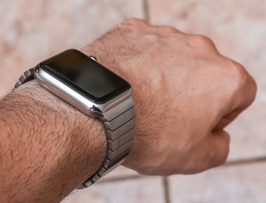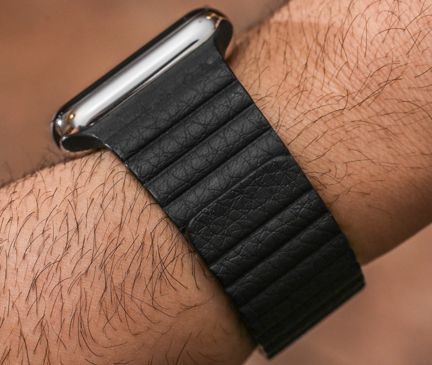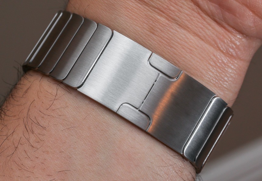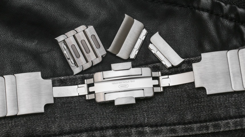 如果您選擇精美的“Link Bracelet”,您會(huì)發(fā)現(xiàn)很多很棒的細(xì)節(jié),首先是它的尺寸很容易調(diào)整。不需要任何工具,這個(gè)過(guò)程既直觀(guān)又精致,因?yàn)槟恍璋聪旅總€(gè)鏈接后面的小按鈕即可釋放它們。手鐲有一個(gè)蝴蝶式展開(kāi)扣,設(shè)計(jì)巧妙,幾乎與手鐲的其余部分齊平。這讓我想起了舊的勞力士手鐲——在一些型號(hào)上,比如潛航者,它有厚而丑的展開(kāi)部分(謝天謝地,他們?cè)O(shè)計(jì)出來(lái)了)——考慮到蘋(píng)果公司恰恰相反,他們的解決方案非常薄。