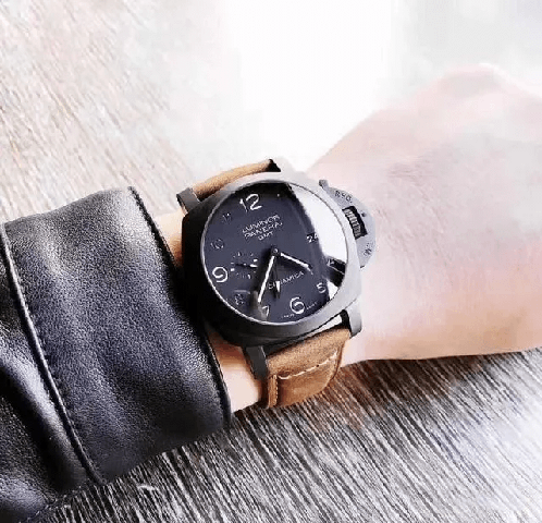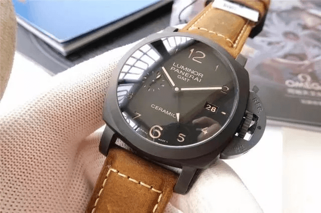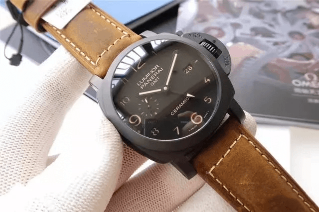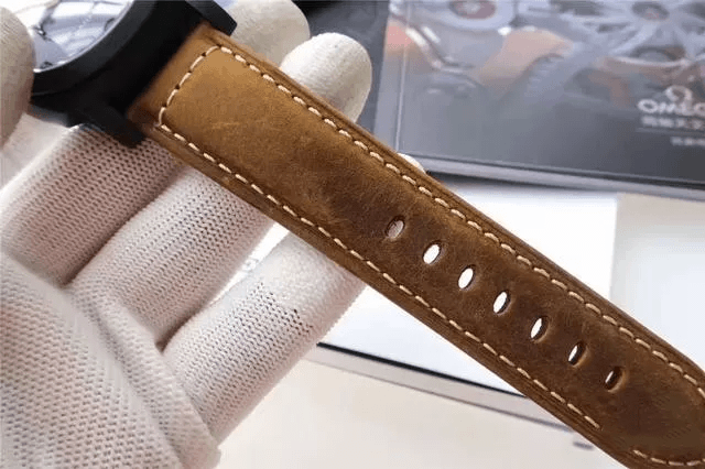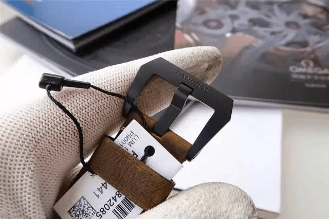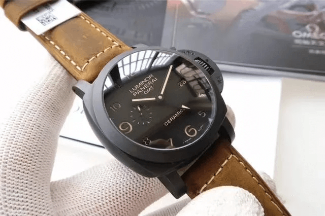 首先按照慣例還是先普及一下參數,以免部分表友還不了解,PAM00441是沛納海現代系列,圓形的表殼直徑為44毫米,大號表盤也是沛納海的一貫風格。表殼和表盤的顏色都為黑色,加上陶瓷的材質,可以完美的將沛納海外形的氣質表現出來。表冠為精鋼和磨砂精鋼的材質,并且有沛納海標志性表橋的保護,在結構上讓腕表更加穩固的同時也讓腕表更加的穩重,給人一種沉穩可靠的感覺。表鏡為藍寶石水晶的材質,透過表鏡可以看見獨具沛納海特色的阿拉伯數字時標以及12點鐘方向顯眼的品牌LOGO,日期顯示窗和小秒針表盤對稱的分布在3點和9點鐘位置,增加了表盤的內容,為我們呈現出了對稱美感。這款表還應用了背透的設計,雖然機芯沒有什么閃亮的金屬光澤,但是在陶瓷表殼的包圍之下也散發出了硬朗的氣息。再加上配有大號鈦金屬表扣的牛皮表帶,符合沛納海慣的休閑風格。