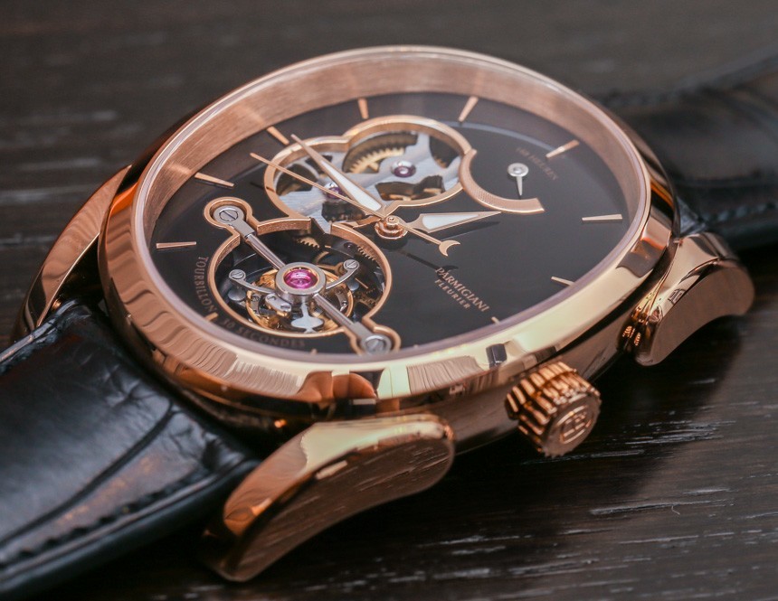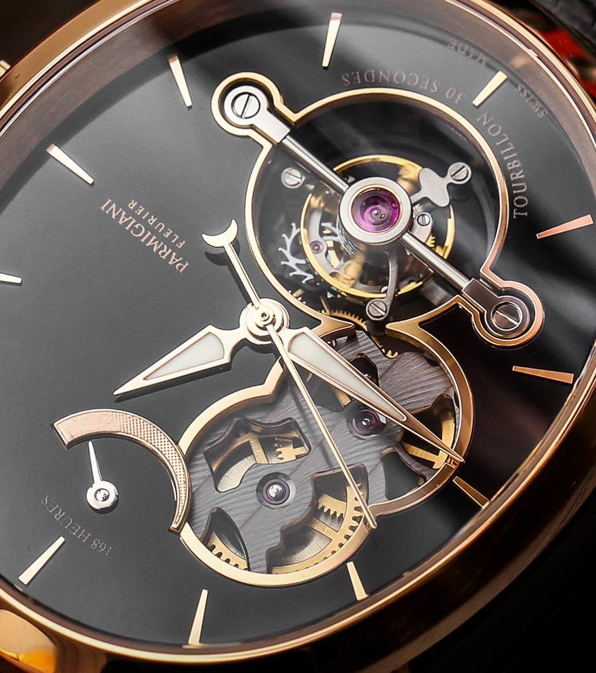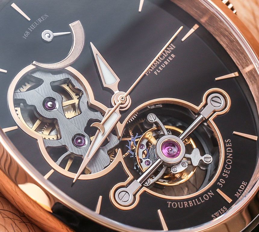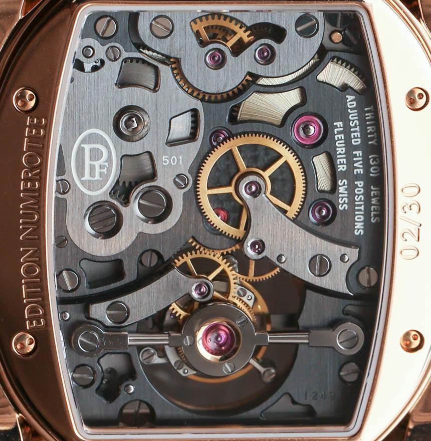 手表內(nèi)部是內(nèi)部制造和設(shè)計的 Parmigiani Calibre PF501 手動上鏈機(jī)芯,具有整整一周的動力儲存。這是通過表盤頂部方便的動力儲存指示器測量的,指示完整的 163 小時動力儲存。機(jī)芯以 3Hz(21,600 bph)運(yùn)行,陀飛輪的獨(dú)特之處在于它每 30 秒旋轉(zhuǎn)一次,而不是每 60 秒旋轉(zhuǎn)一次。您還可以注意到機(jī)芯中硅部件的使用,例如擒縱機(jī)構(gòu)。