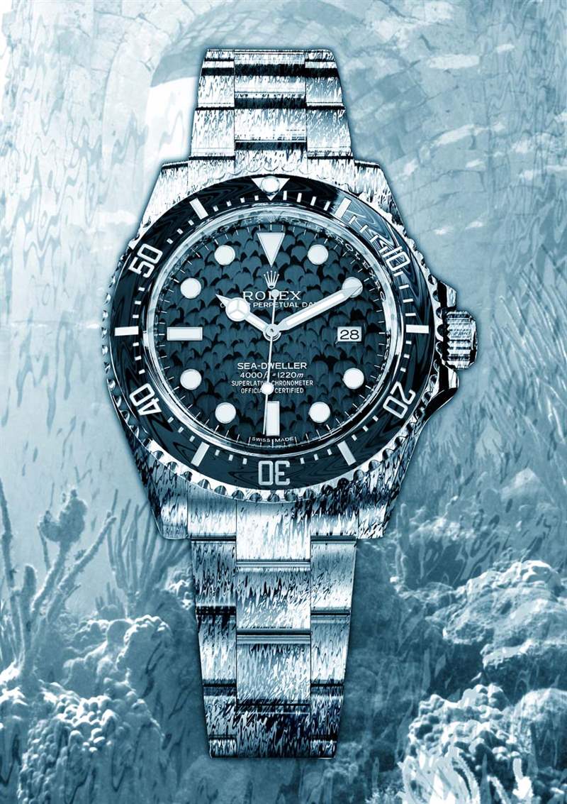 潛水表的靈感來自水嗎?是和不是。勞力士 Sea-Dweller 4000 Water 概念就是這樣,并從流動的液體和海洋生物中汲取靈感。Niklas 將這款 Sea-Dweller 設計想象成“大馬士革鋼,具有流動的幾乎液態金屬表面的幻覺。它有一個帶有特寫鯊魚皮圖案的表盤。終極潛水表應該看起來像鯊魚一樣銳利!這是一款海洋生物手表,可能會愛或恐懼。或兩者!” 這是一個有趣且兩極分化的概念,再次借鑒了自然紋理和美學。