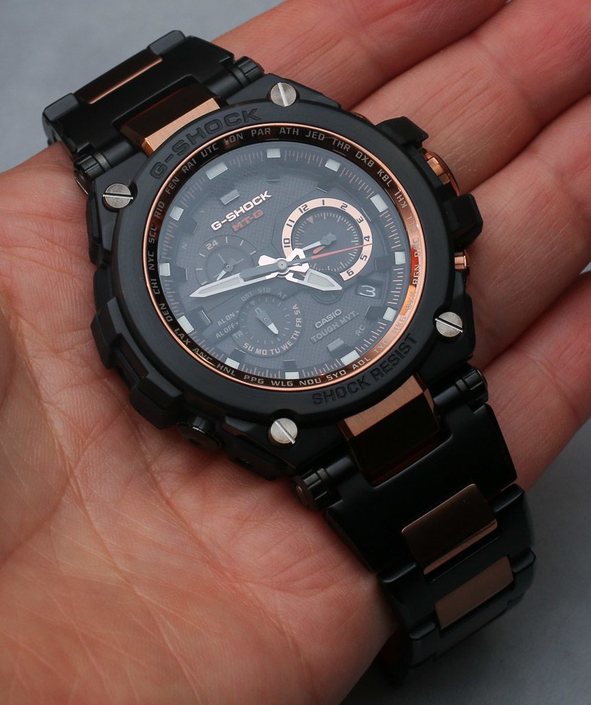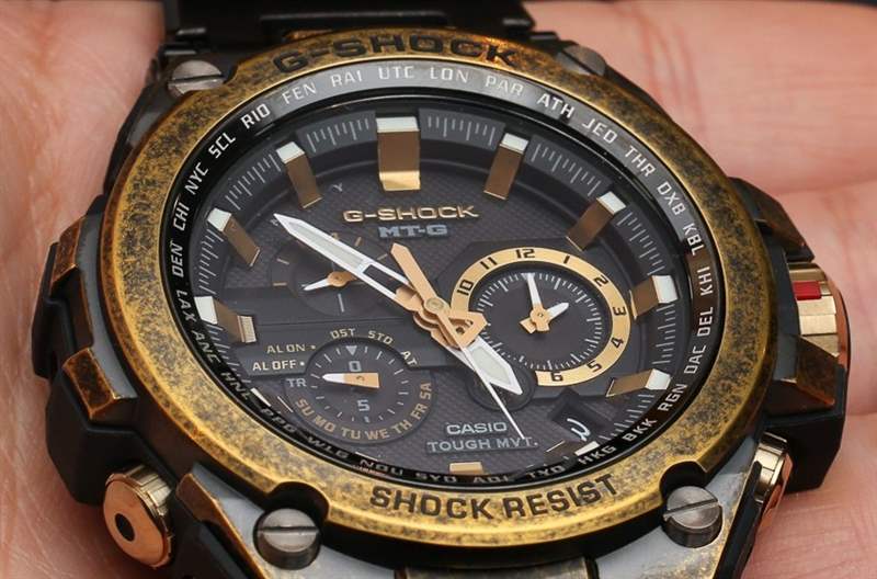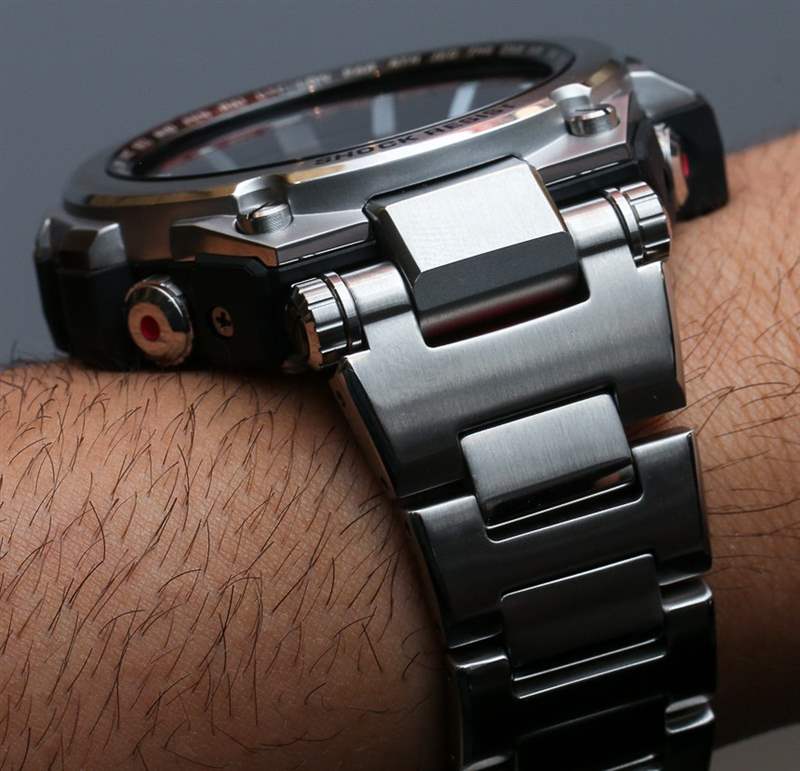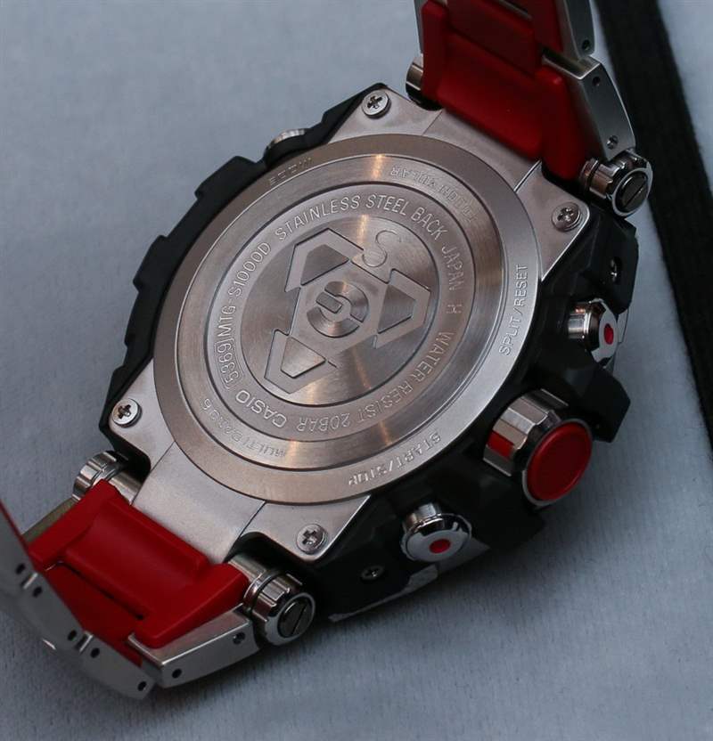Casio G-Shock MT-G 外殼背面的那種三角形標志是大多數高端 G-Shock 上使用的特殊符號,稱為“Triple G Resist”。這意味著手表特別能抵抗 1) 沖擊、2) 振動和 3) 離心力(高速)。與大多數卡西歐 G-Shock 手表一樣,MT-G 手表防水深度達 200 米,作為高端 G-Shock 手表,它們具有鍍增透膜的藍寶石水晶。在手腕上,它們比 MR-G 手表大一點,寬 53.5 毫米。它很大,但特殊(或多或少牢不可破)管狀樞軸上的完整鉸接式表耳非常適合讓手表牢固地抓住您的手腕。