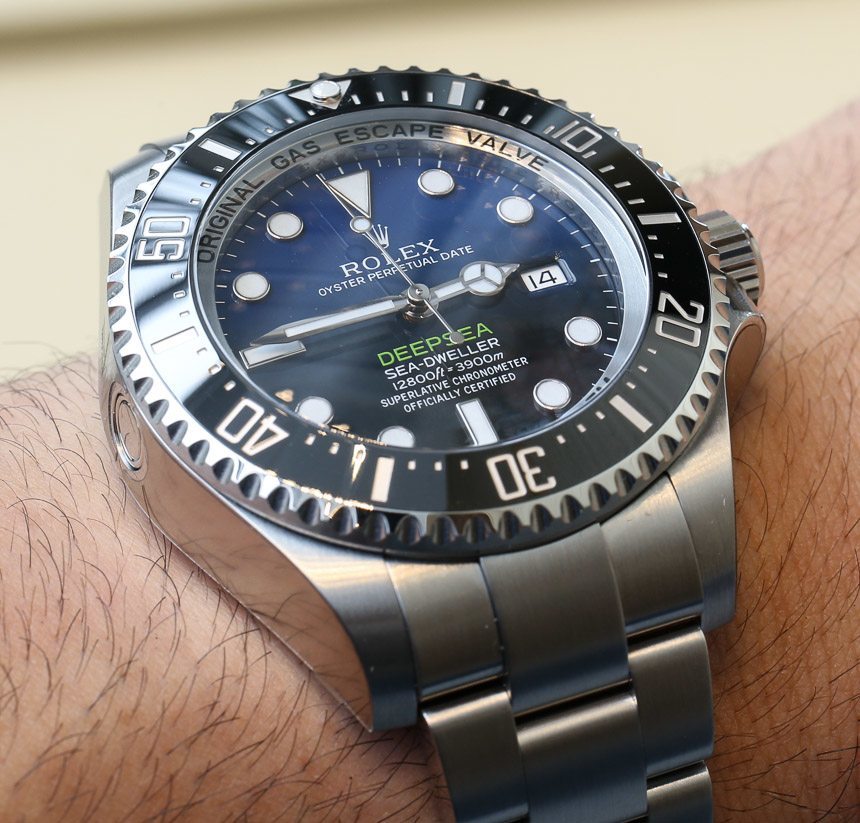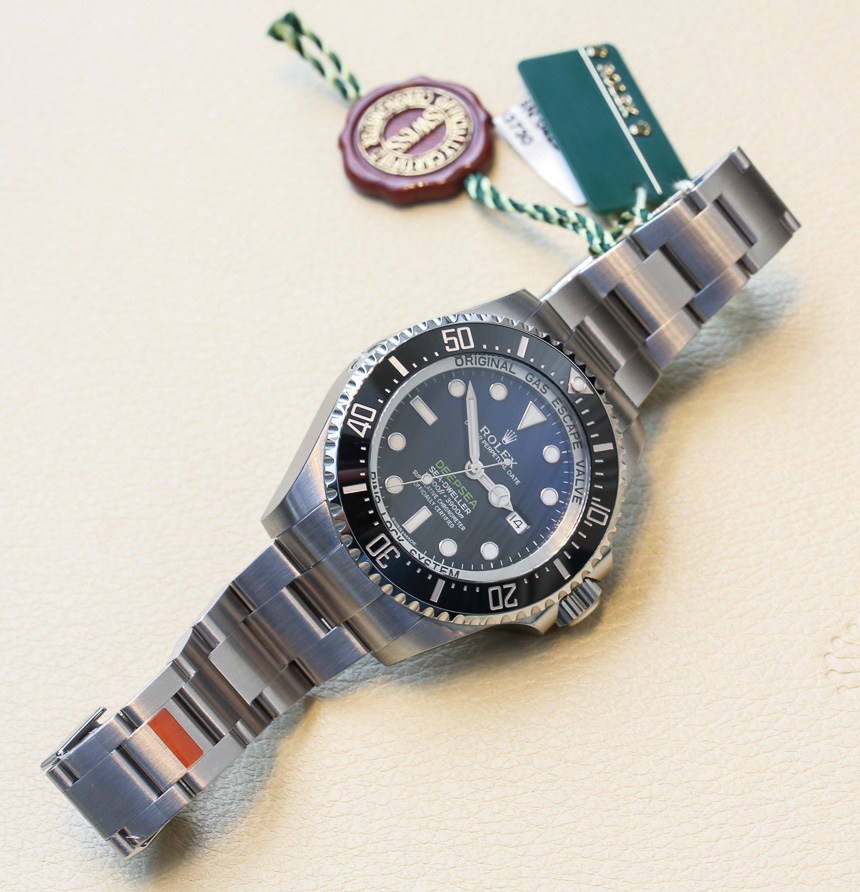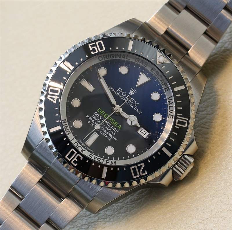 Rolex Deepsea Sea-Dweller D-Blue 是目前勞力士生產的性能最高的潛水表,也是最大的厚表殼(17.7 毫米)和寬表殼(44 毫米寬)。它配備蠔式表鏈,由 904L 鋼制成。手表的底蓋是鈦金屬的,它具有一系列有助于提供巨大防水性能的功能,例如環鎖系統和表盤上巨大的 5 毫米厚藍寶石水晶。