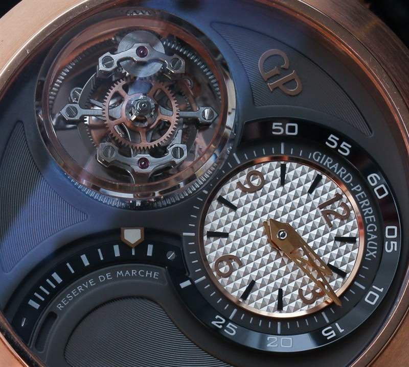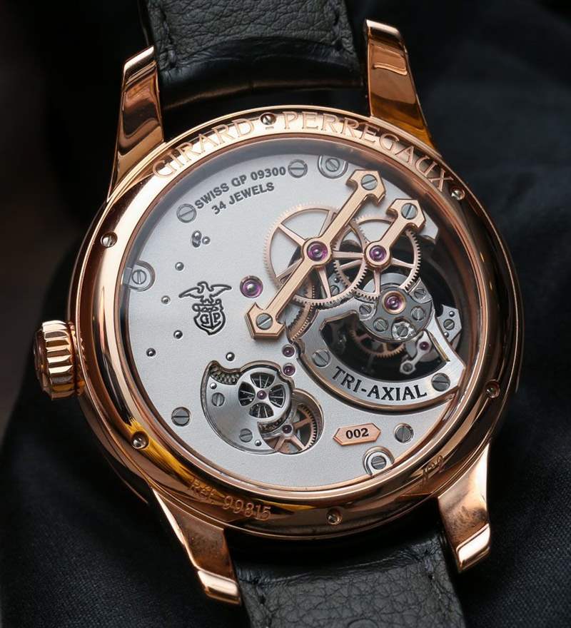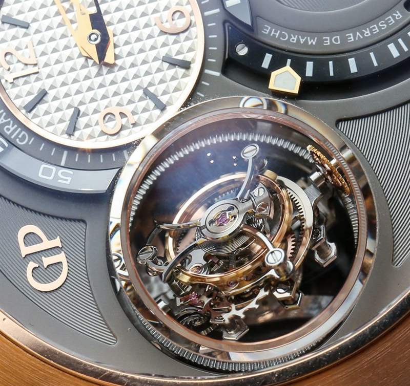 具有多個軸點的陀飛輪的生產(chǎn)和設計特別困難,因為陀飛輪中有陀飛輪。Girard-Perregaux 三軸陀飛輪由中央一分鐘(60 秒)陀飛輪、中間 30 秒陀飛輪和外部 2 分鐘(120 秒)陀飛輪組成。這意味著每個軸點以不同的速率旋轉,視覺效果非常令人印象深刻。還有令人難以置信的小零件密度。
