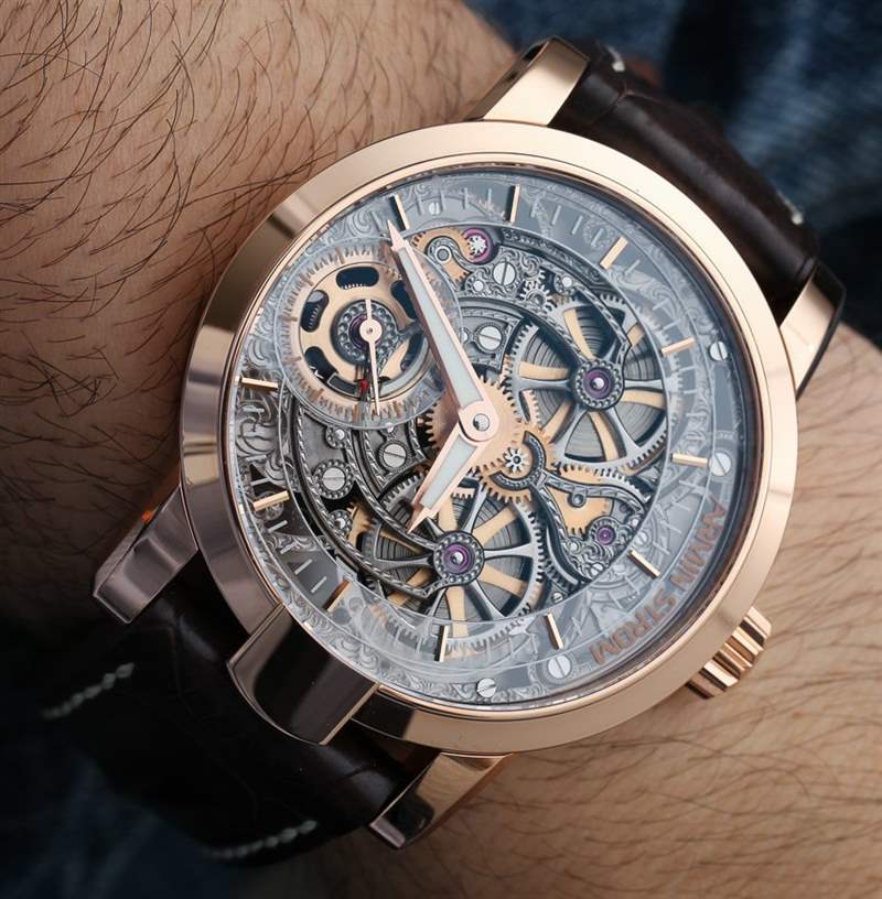 事實證明,我所有的秘密關注只會讓事情變得更糟。我希望在私下看了 One Week Skeleton 足夠長的時間后,我會忘記它,并認為它只是另一種暫時的手表迷戀。然而這一次我認為鐘表的欲望太深了。Armin Strom 采用 43.40 毫米寬的表殼,由拋光和拉絲 18k 玫瑰金制成,包括他們慣用的“表殼標簽”,用于簽名。沒錯,他們會將您的姓名首字母寫在表殼上,以表明您對他們手表的所有權。我多么想要一周骨架上的“AA”!廣告留言廣告信息結束