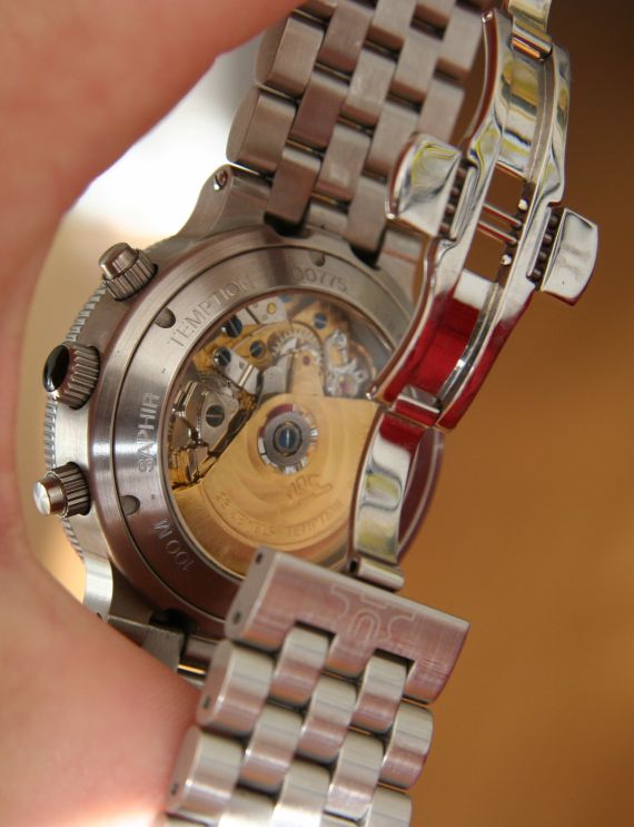 Valjoux 7751基于非常受歡迎的Valjoux 7750計(jì)時(shí)碼表。7751增加了一些復(fù)雜功能,包括:月相,同步24小時(shí)時(shí)間指示器,帶有月份,星期幾和面部周邊日期的完整日歷。7751當(dāng)然是自動(dòng)變速箱,Temption提供了一個(gè)可愛(ài)的透明表背。我的版本有鍍金或鍍金版本的機(jī)芯,但我見(jiàn)過(guò)只是鋼的機(jī)芯??偟膩?lái)說(shuō),該運(yùn)動(dòng)不是本次審查的主題,但我對(duì)此感到滿意。很多時(shí)候,運(yùn)動(dòng)的復(fù)雜性需要一些古怪的操作。例如,用于校正日期的系統(tǒng)可能更直觀,但這是機(jī)芯的問(wèn)題,而不是手表的問(wèn)題。