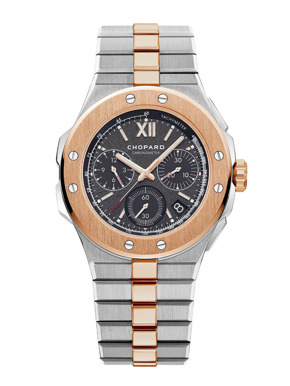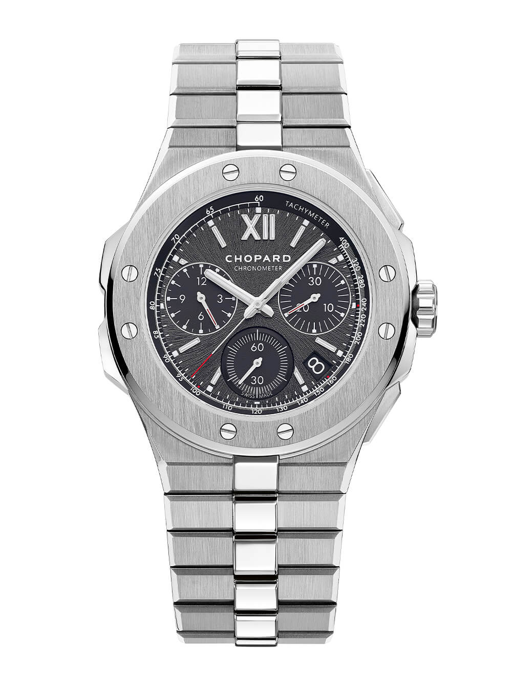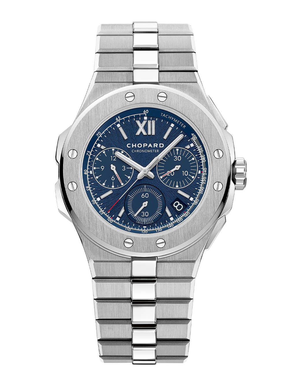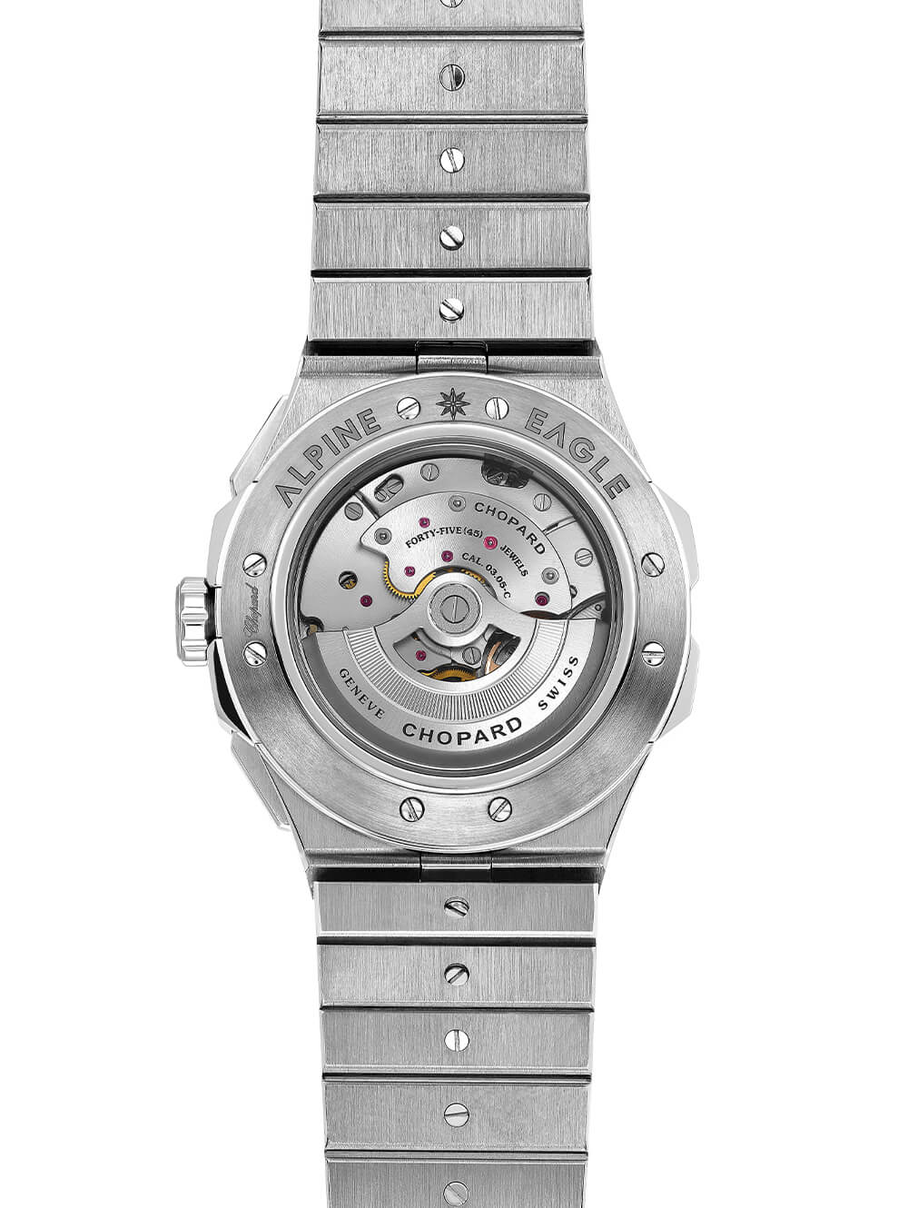 Alpine Eagle XL Chrono 增加了一個(gè)飛返計(jì)時(shí)碼表,該計(jì)時(shí)碼表由 Chopard 完全內(nèi)部 03.05-C COSC 認(rèn)證的自動導(dǎo)柱輪計(jì)時(shí)碼表機(jī)芯提供,該機(jī)芯擁有 60 小時(shí)的動力儲存,并已在 Chopard 的運(yùn)動型 Mille Miglia 計(jì)時(shí)碼表中證明了自己。