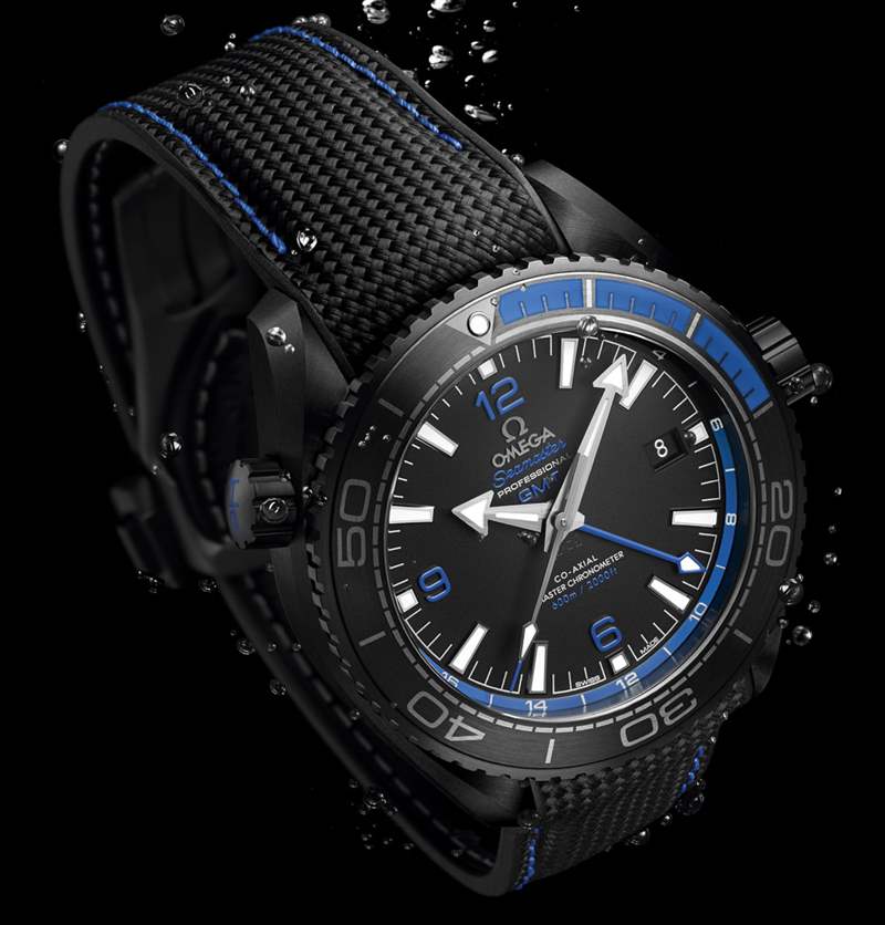 另一款海馬系列海洋宇宙600米45.5毫米至臻天文臺GMT「深海之黑」專業潛水表,其啞光黑色表殼為歐米茄采用改良工藝由整塊陶瓷精制而成,酷炫之余尤其地時尚。其單向旋轉表圈、24小時標識、GMT指針、阿拉伯數字時標乃至橡膠表帶上的縫線都點綴著藍色,恰如其分地揭示了其專業潛水表的特殊定位。設計元素,直接凸顯了該表的高科技含量,也讓它格外吸引眼球。