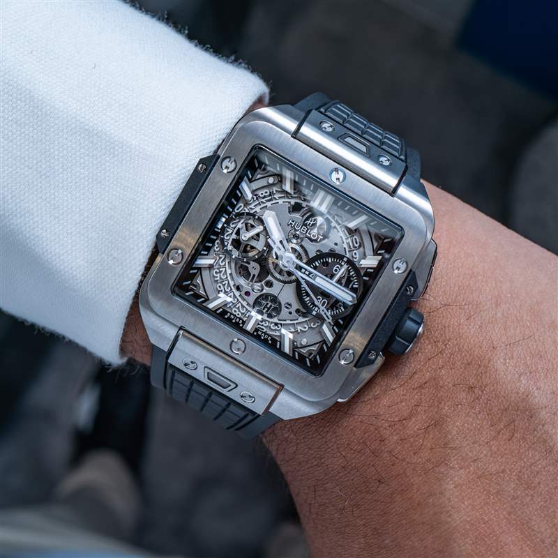 方形手表比圓形手表更難做對。出于這個原因,手表市場上流行的方形(相對于圓形)時計要少得多。宇舶表從未真正在方形手表上取得成功,而 Square Bang 做得很好。因此,在某些方面,這只是宇舶表展示其設計技巧和與該領域其他品牌競爭的能力。消費者贏了,因為有些人真的很喜歡方形手表。我有幾個(比如桑托斯),可以很容易地說戴有棱角的表殼的大膽是真實的。也許不適合日常使用,但它是圓形手表的有趣且視覺上有趣的替代品。宇舶的策略很可能是為 Big Bang 粉絲提供一種新的方式來享受他們已經喜歡的東西,但提供的方式不僅僅是新的顏色或材料。