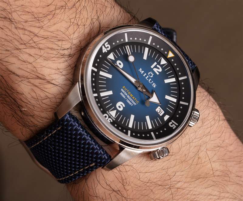 Milus Archimedes 表盤上沒有多少原創感,但這是手表最強大的部分,有助于增加其性感魅力。我真的很喜歡手,既清晰又拋光。這些形狀使它們脫穎而出,它們是寬箭頭式時針,太妃分針和大橄欖棒秒針。表盤標記上涂有豐富的夜光漆,并且肯定具有復古潛水表的氛圍。臉部本身有一點顏色漸變,正如您在圖片中看到的那樣,Milus 目前提供 Milus Archimedes Blue 和 Milus Archimedes Black。具有諷刺意味的是,阿基米德黑主要是棕色,而米盧斯阿基米德藍中的黑色比黑色更多。我將它們重命名為 Archimedes Dark & Stormy 和 Archimedes Depth Blue。