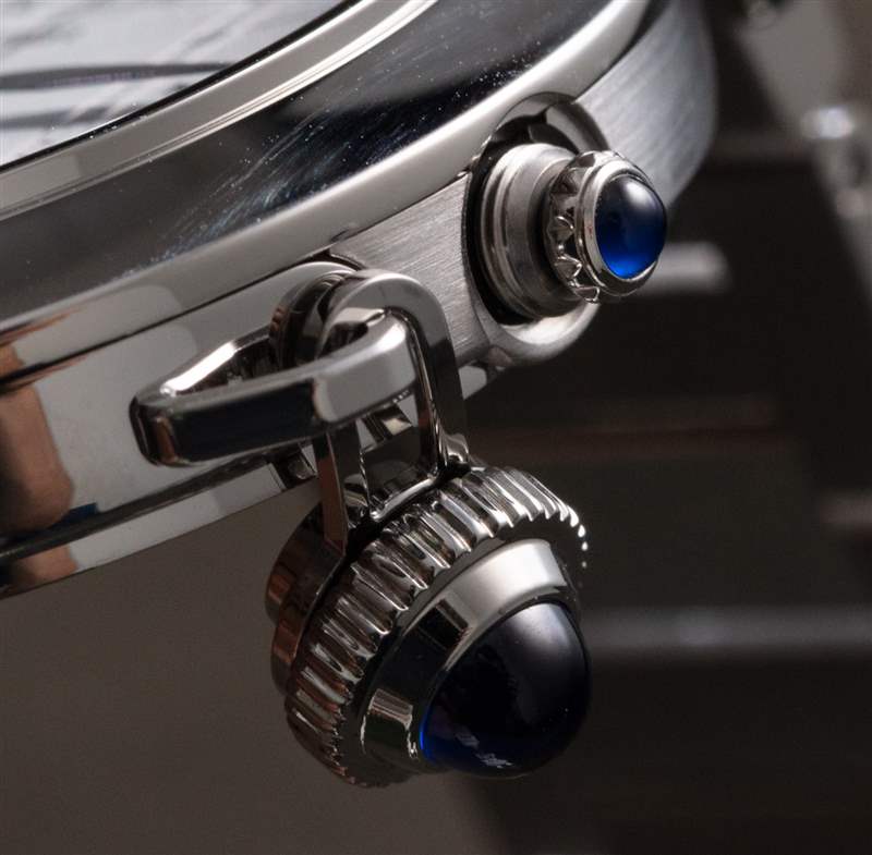 卡地亞將這一歷史悠久的工程元素融入設計理念。它不是唯一這樣做的品牌,但卡地亞以最奢華的方式做到了這一點。請注意,我在這里拍攝的手表是零售樣品,因此它的表殼和表鏈部分仍然有塑料保護。外部表冠帽和內部較小的表冠各有藍色尖晶石凸圓形。沒有它就不會是卡地亞 Pasha。對于運動型手表來說,Pasha 實際上很薄。41 毫米寬的表殼只有 9.5 毫米厚。就性能而言,它可能不是傳統的潛水表,但它足夠薄,佩戴舒適不礙事,受到當今很多佩戴者的高度重視。