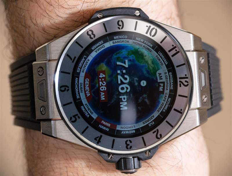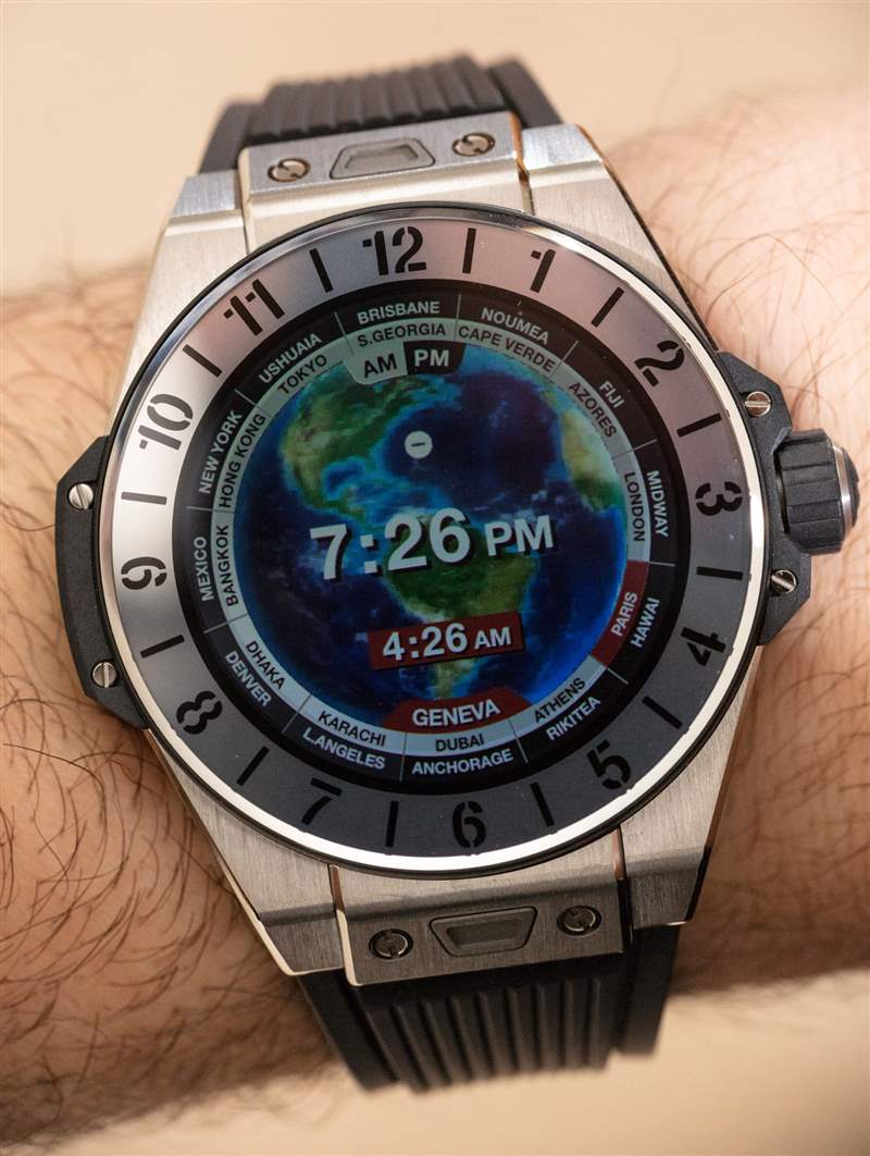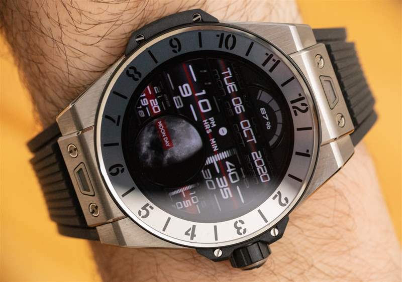 宇舶表提供了幾個版本的 Big Bang e,包括這款鈦金屬表殼表款以及藍色或黑色陶瓷表款。它們都在表圈和宇舶表精心設計的易于釋放的表帶更換系統上安裝了藍寶石水晶。彩色觸摸屏與藍寶石水晶的結合做得非常好,因為表盤感覺它根本沒有沉入,而是就在屏幕的最頂部,就好像它漂浮在藍寶石水晶中一樣。屏幕很亮,觸摸屏反應靈敏。
