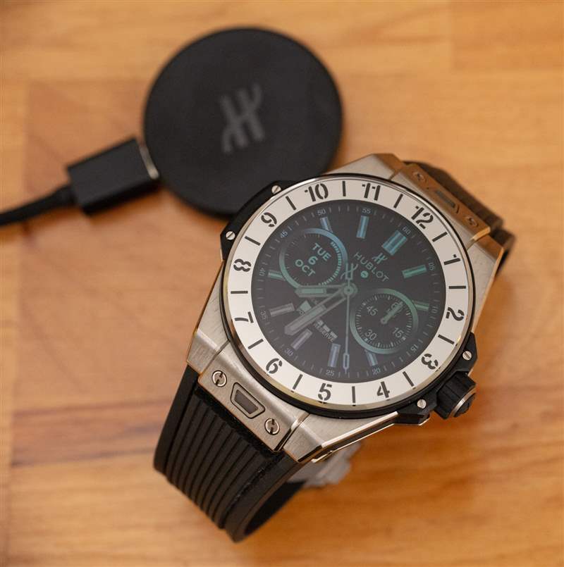 電池續航時間約為一天,您需要經常為 Big Bang e 充電。Hublot 提供基于磁接觸的充電器。它很體面,但不夠花哨。它迫使您將手表側放或正面充電,這不是奢侈手表行業訓練人們處理手表的方式。我認為宇舶應該設計某種類型的可選支架來放置手表,以便在充電的同時不冒劃傷表殼的風險。這不是一個交易破壞者,但它表明宇舶尚未習慣佩戴智能手表與傳統手表不同的各種細微差別 – 在人體工程學方面,它們往往會表現出色。