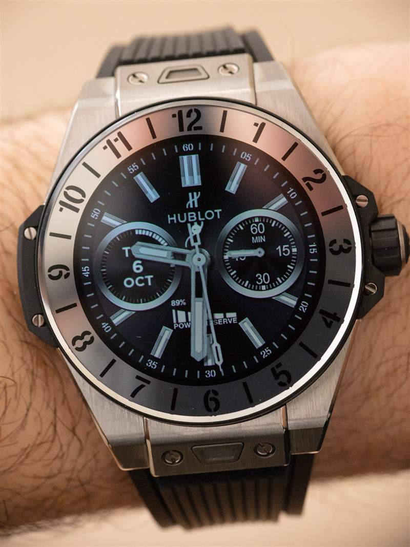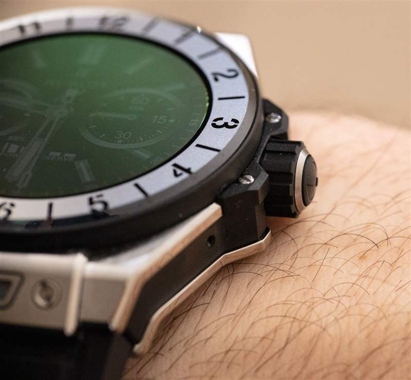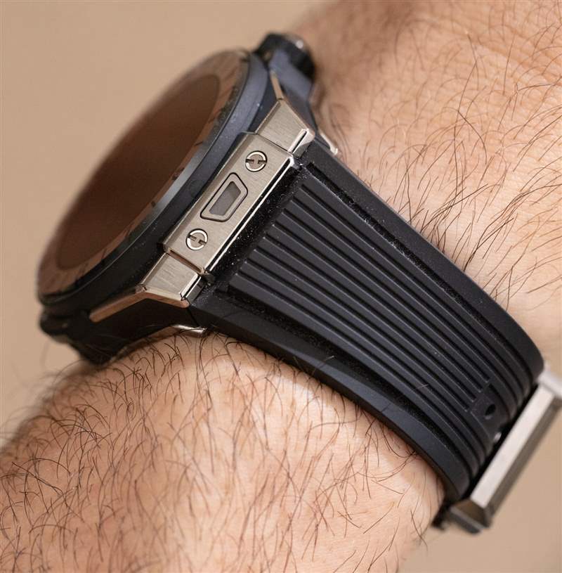 何為大事?因為它有助于 Big Bang e 的佩戴體驗與標準 Big Bang 的佩戴體驗驚人地相似。不,手表并不完全相同,但我第一次佩戴了一款我經常忘記是智能手表的豪華智能手表。這意味著 42 毫米寬的表殼尺寸(約 13 毫米厚,??約 55 毫米的表耳到表耳距離,以及 30 米防水)Big Bang e 的尺寸與其機械表親的尺寸大致相同——而且它們都具有相似的表殼材料和飾面。在許多方面,宇舶 Big Bang e 佩戴者與傳統 Big Bang 腕表佩戴者非常契合。因此,雖然宇舶 Big Bang e 對于智能手表來說價格昂貴,但對于宇舶來說卻是相對便宜的。