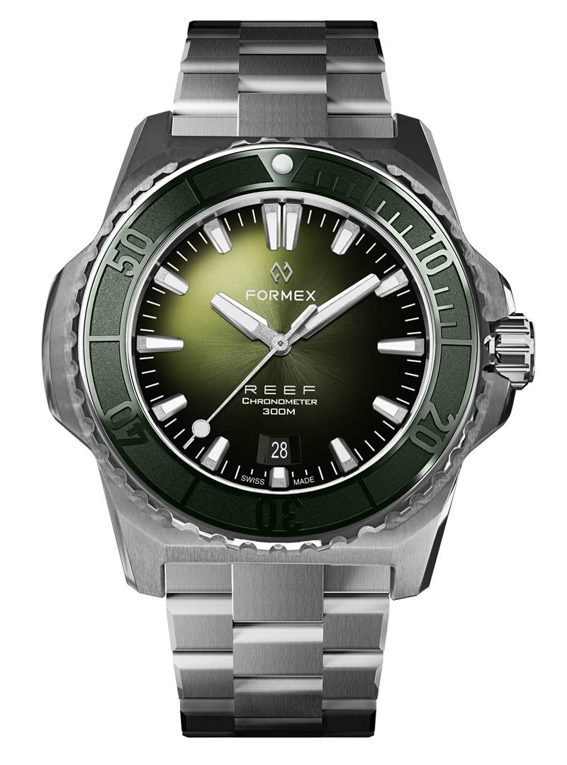 說到表盤,每款 REEF 手表都有一個經過太陽光線拋光的表面,采用類似于汽車面板涂漆的特殊技術,由手工精心噴涂而成。這使用多層和仔細的油漆量來創(chuàng)造豐富、一致的外觀。可用的表盤顏色包括深藍、海洋黑、珊瑚綠或漸變銀色。表盤設計本身的靈感來自 Formex Essence,配備更強大的指針和時標,以在黑暗、潮濕的條件下提供最佳易讀性。在價格低于 2,000 美元的手表中通常不會發(fā)現這種工藝水平,但像 Formex 這樣的瑞士制造品牌開始改變這一點。