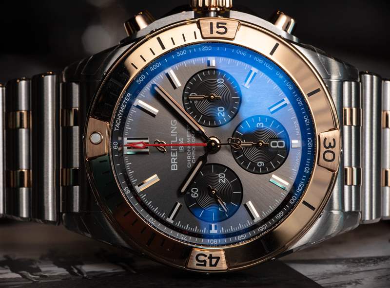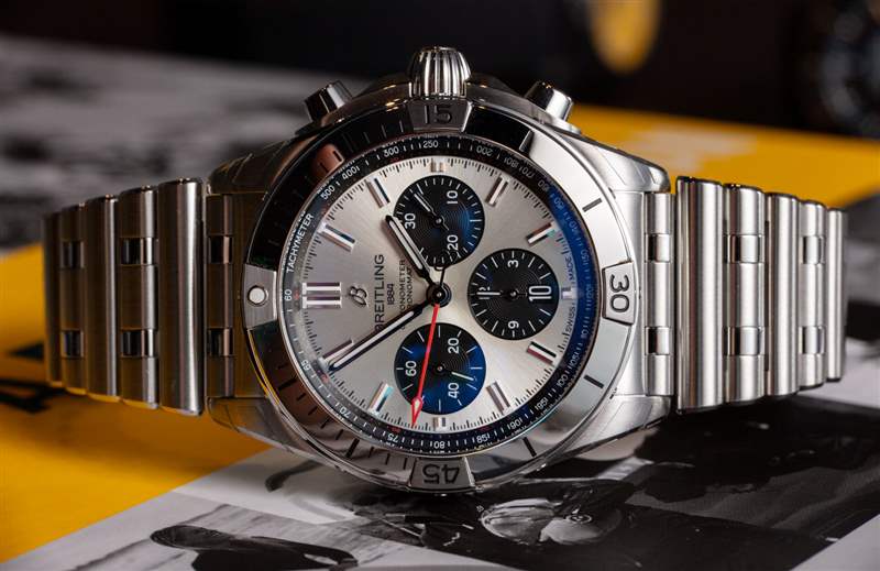 包括百年靈在內的許多品牌都對更新的老式“熱狗棒”式時針和分針感到高興,讓它們感覺更加現代和棱角分明。同樣,新款 Chronomat 的指針采用復古 Chronomat 手表的形狀,并根據當今的品味進行渲染。Chronomat 腕表的三倍數陣列計時表盤非常精致優雅,展現出當今百年靈所鐘愛的一種簡約保守主義。表盤體驗之所以奏效,是因為熟悉的外觀以及對顏色和材料的良好使用。百年靈在這方面并沒有太多創新,但我認為表盤不會讓任何人感覺到“那是一塊漂亮的手表”。