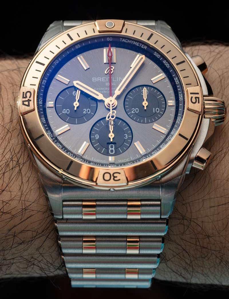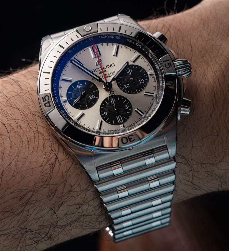 我確實喜歡百年靈設法設計出旋入式計時碼表按鈕。這種殘留元素旨在提供更多的防水和元素阻力,但在很大程度上只是阻止了更多人使用計時碼表。在沒有旋入式計時按鈕的情況下,這款手表仍然能夠防水 200 米——在我看來,這是成功的。我也喜歡表冠略顯超大的外觀,以及表殼右側整個表冠和按鈕區域的設計。根據您的品味和預算,百年靈提供全鋼的 Chronomat B01 42 表殼和表鏈,或為雙色表款提供不同程度的黃金。存在全金模型,但我還不相信有純金手鐲選項。最終,會有,