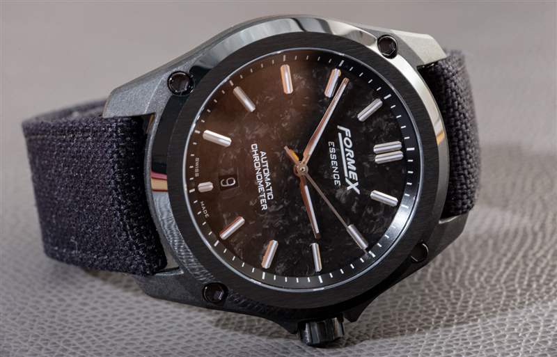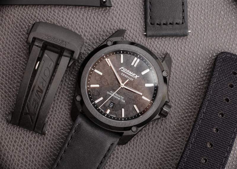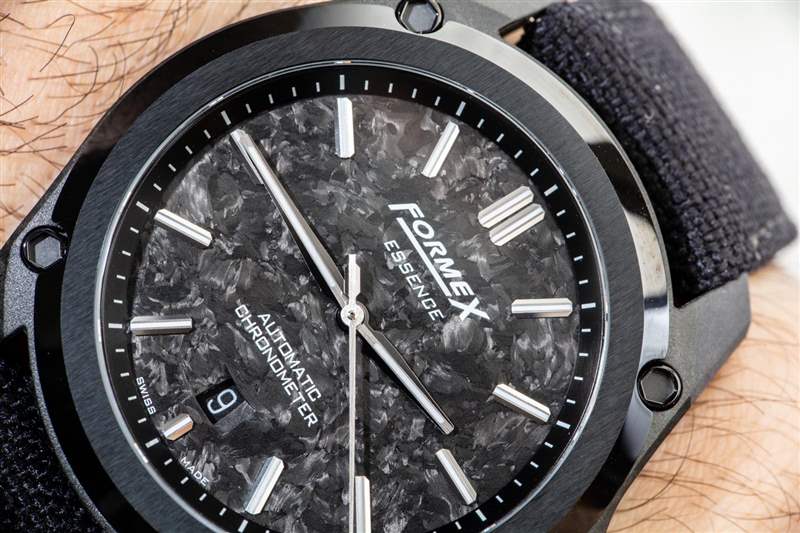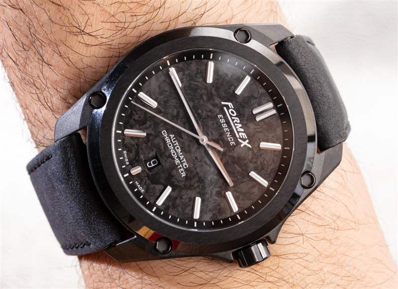 這也是獲得黑色手表的好方法。與其他具有有機(jī)紋理的鍛造碳材料不同,Essence Leggera 表殼非常均勻,按照工業(yè)標(biāo)準(zhǔn)“外觀完美”。它為手表注入了一種溫暖的有機(jī)感覺,F(xiàn)ormex(對(duì)于這個(gè)特定版本的手表)使用了一個(gè)薄的鍛造碳表盤,當(dāng)切割時(shí),它具有更多的有機(jī)質(zhì)感。其他版本的 Essence Leggera 有,例如,隕石表盤(用于 Essence Leggera Space Rock),以及更保守的表盤選項(xiàng)。我完全希望 Formex 在未來繼續(xù)使用 Essence Leggera 的各種美學(xué)變體。