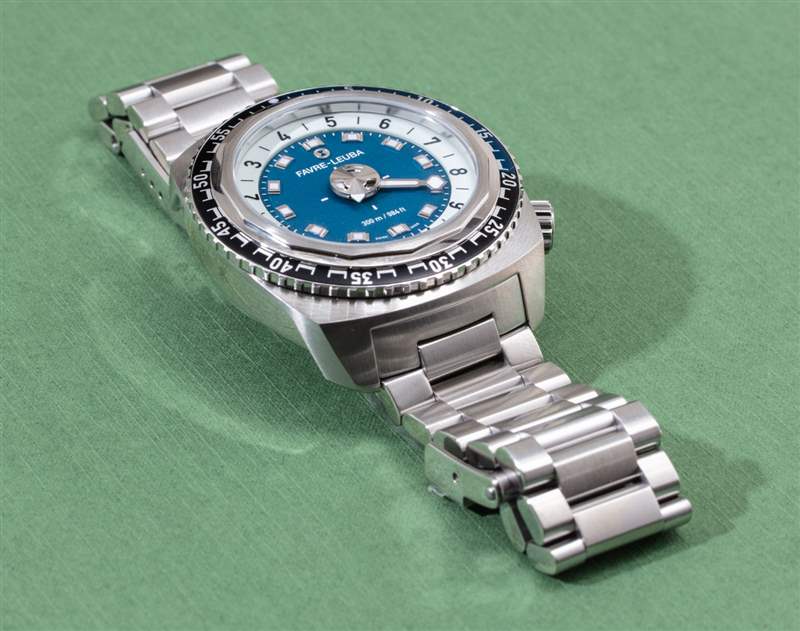 我真的很喜歡 Favre-Leuba 嫁給手表的手鐲,盡管它簡單明了。鏈節(jié)本身并沒有那么長,這意味著手鐲會使用更多鏈節(jié),并且手腕上的關(guān)節(jié)更舒適。展開式搭扣制作精良,設(shè)計經(jīng)典。它是一個折疊式安全扣,帶有隱藏的潛水員延伸部分。我也喜歡微調(diào)手鐲的能力。我發(fā)現(xiàn)手鐲戴在手腕上很舒服。Favre-Leuba 還提供帶有定制橡膠或皮革表帶的 Raider Harpoon 42。說到選項,除了這種藍色、黑色和白色的表盤設(shè)計,Raider Harpoon 還有橙色、黑色和白色選項。