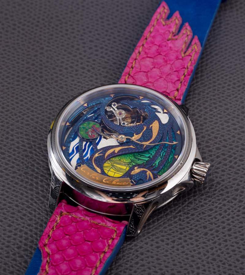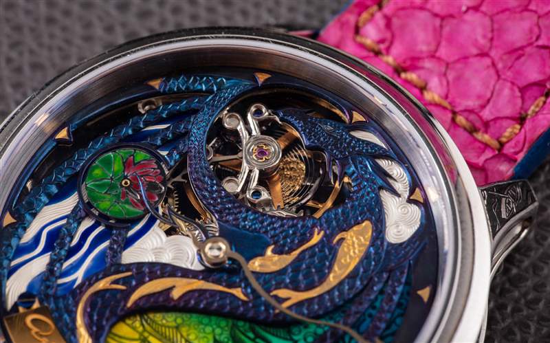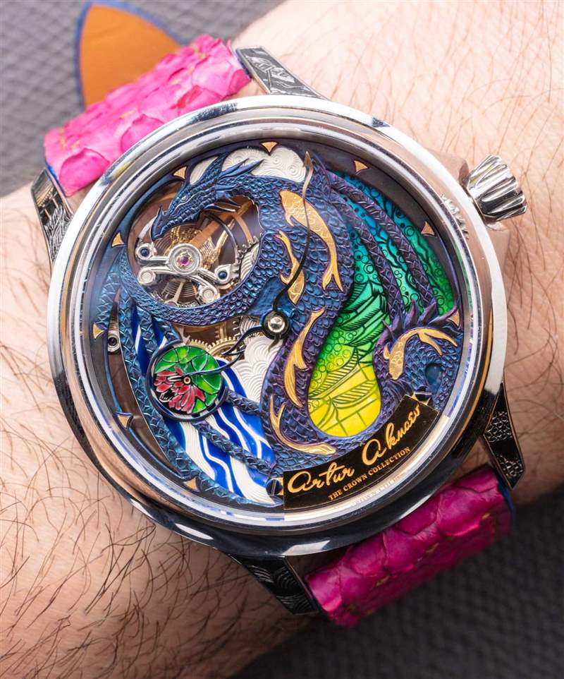 The Rise Of The Blue Dragon 腕表是 Akmaev 對遠東風格龍與現(xiàn)代幻想主題的藝術(shù)探索的一部分。這款手表在洛杉磯的一家名為 The Crown Collection 的藝術(shù)畫廊出售。Akmaev 特別想在表盤上強調(diào)一系列藝術(shù)技巧,并強調(diào)鮮艷的色彩。在那個追求中,我相信他成功了。精致的表盤呈現(xiàn)為藍色、綠色、黃色和粉色。這是使用火焰藍色金屬和微型表盤繪畫的混合物來完成的。表盤還采用了一系列手工雕刻的藝術(shù)技術(shù),延伸到機芯以及表殼的某些部分(例如表耳)。廣告訊息廣告信息結(jié)束