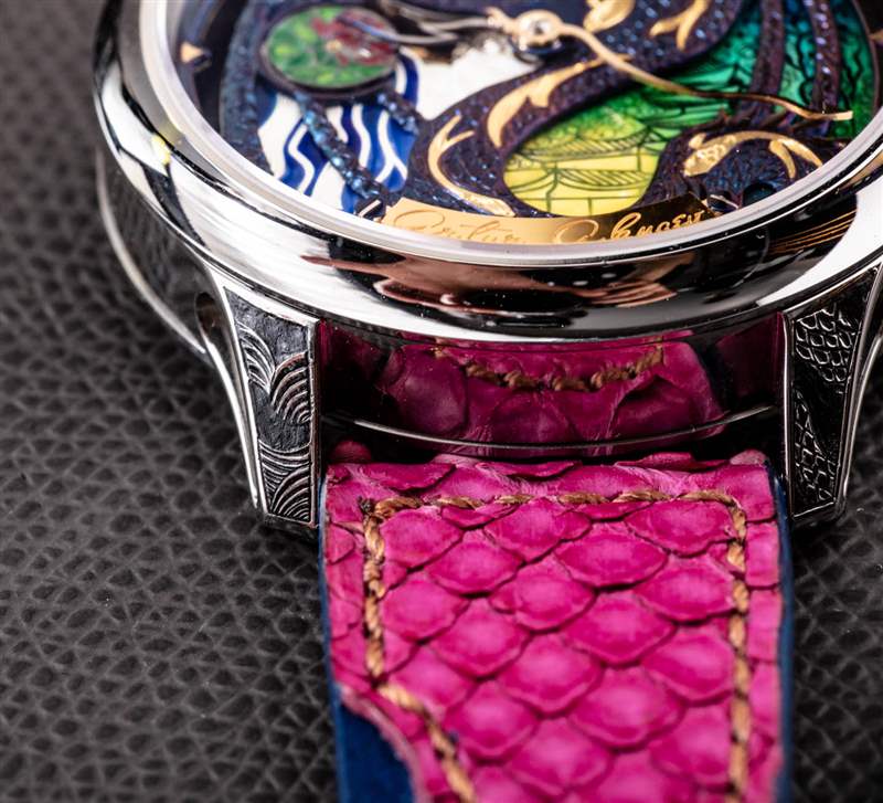 為了與色彩繽紛的 The Rise Of The Blue Dragon 表盤相得益彰,Akmaev 有一條在美國生產(chǎn)的定制表帶,它是藍色皮革底座,頂部縫有粉紅色的蟒蛇皮“翅膀”。當然,表帶有點華而不實(在其他華而不實的手表上),但我認為它有助于完善手表的活潑個性。以龍為主題的腕表在腕表領(lǐng)域并不罕見,但有趣的是龍主題是如何以如此多不同的方式表達的。我認為 Artur Akmaev 會發(fā)現(xiàn)足夠多的手表愛好者對他在這些非常真實的時計上手工繪制神話野獸的特殊方式感興趣。