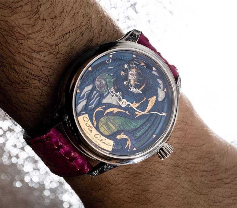 對于手,Akmaev 手工制作了讓人聯(lián)想到龍翼外觀的形狀。盡管指針長度適中且技術(shù)精湛,但它們?nèi)噪y以與華麗的表盤形成有效對比。這抑制了易讀性,但不是致命的。Artur Akmaev 在表盤上設(shè)計了小小時標記點也很好。