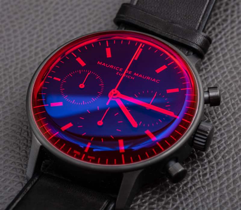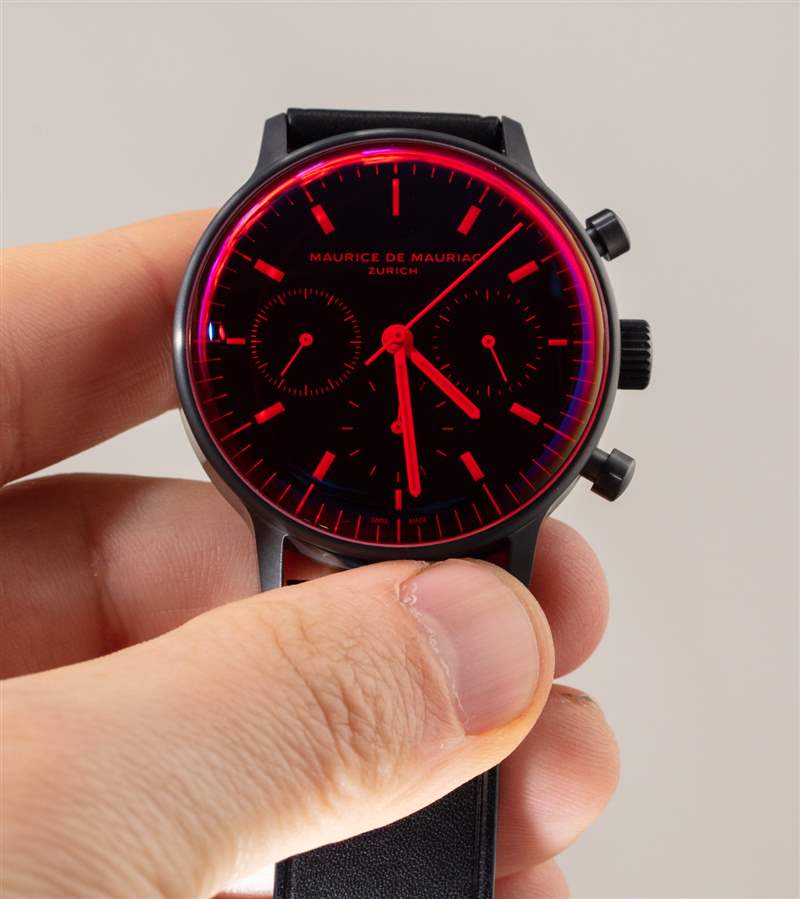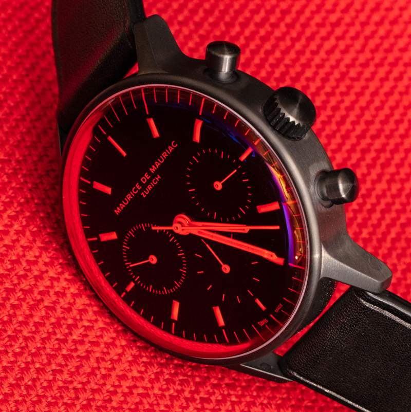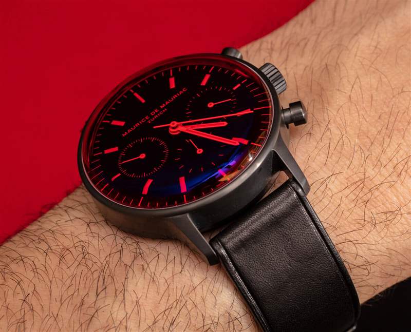 L3 Chronograph 表殼寬 40.5 毫米,厚約 13-14 毫米,表耳到表耳的距離約為 48 毫米,表帶的表耳寬度為 20 毫米。表殼防水僅為 30 米——不幸的是,這不是一款適合游泳的運(yùn)動(dòng)手表。這種特殊版本的精鋼表殼采用 DLC 涂層,呈現(xiàn)無(wú)煙煤色(不是完全黑色),使其外觀更光滑、更柔和,并與水晶完美搭配。說(shuō)到紅水晶,我確實(shí)提到這是 Maurice de Mauriac 帶回的設(shè)計(jì)美學(xué)。2011 年,我在回顧Maurice de Mauriac Chronograph Modern Tactical Vision 手表時(shí)首次介紹了該品牌的這一非常酷的趨勢(shì)。兩年后的 2020 年,我回顧了一款帶有紅水晶的手表,即Maurice de Mauriac Chronograph Modern Travel Timer.?事實(shí)上,就在莫里斯·德·莫里亞克 (Maurice de Mauriac) 透露這款今天首次亮相的帶有紅色水晶的 L3 計(jì)時(shí)碼表的幾周前,我問,“現(xiàn)在是時(shí)候帶回一些彩色水晶了嗎?”?看起來(lái)他們?cè)谀欠矫姹任翌I(lǐng)先一點(diǎn)。