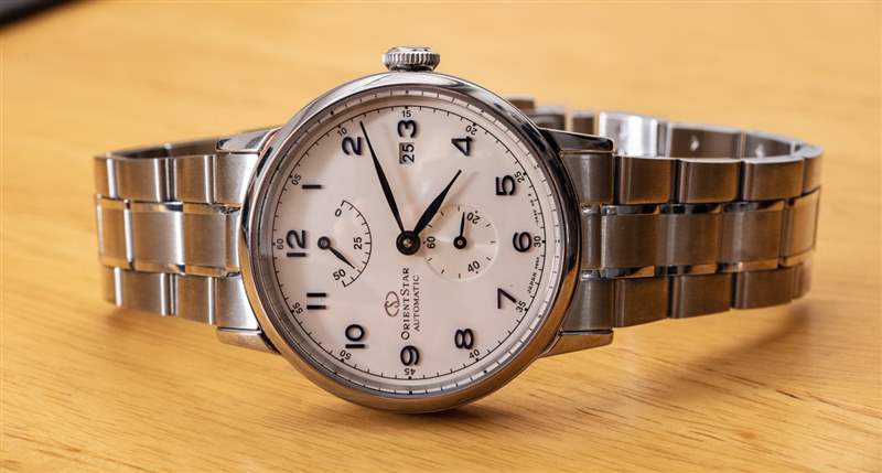 在手腕上,Orient Star Classic Mechanical 采用全拋光鋼制成,寬 38.7 毫米,厚 12.4 毫米(表耳到表耳的距離僅為 46 毫米)。這使得尺寸有點偏小,但作為正裝手表或大多數手腕的袖子非常舒適。該表殼還可以防水 50 米。表盤上方是一個略微圓頂的 AR 涂層藍寶石水晶鏡面。