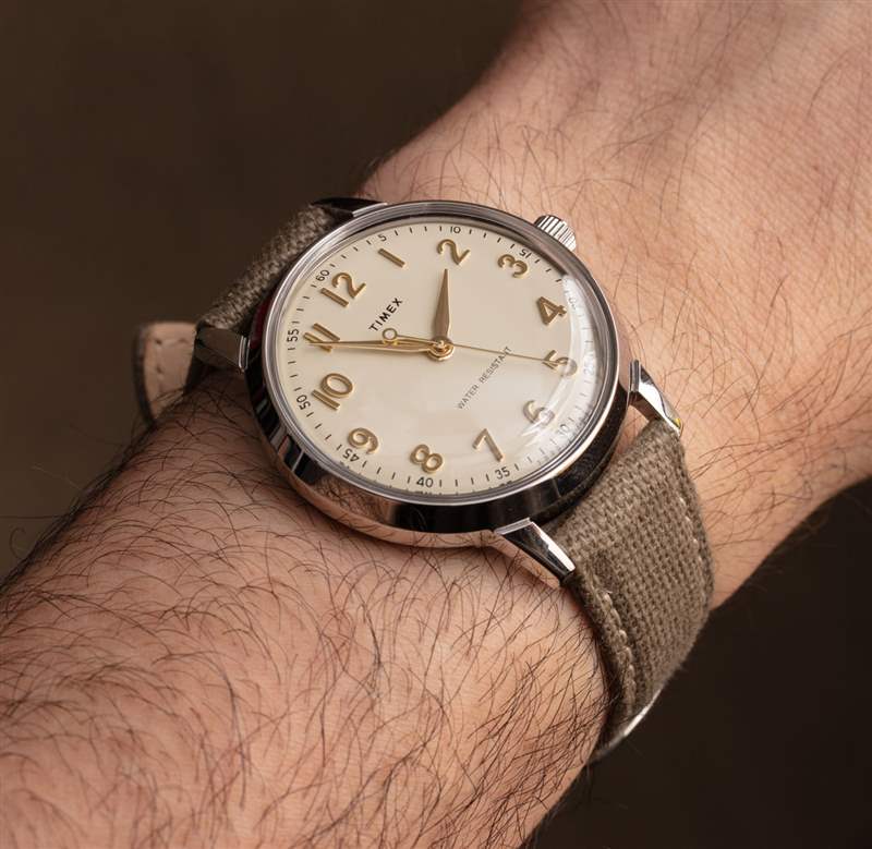 Todd Snyder X Timex Liquor Store 手表的世紀中葉風格表盤搭配橄欖綠色織物表帶(如今的時尚款式),皮革襯里舒適耐用。手表內部是日本 Miyota 自動機芯,可以通過底蓋窗口看到。