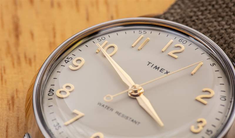 腕表本身為 38 毫米寬的拋光精鋼材質,頂部飾有復古風格的亞克力水晶。表盤為灰白色橄欖色調,飾有金色阿拉伯數字時標和相配的指針。美學是經典/休閑的,是 Todd Snyder 提供的許多衣服的理想日常穿著。手表表盤的易讀性非常高,盡管表殼只有 38 毫米寬,但由于表殼較厚,因此佩戴起來很好,不會讓人感覺太小。表殼防水深度達 50 米。