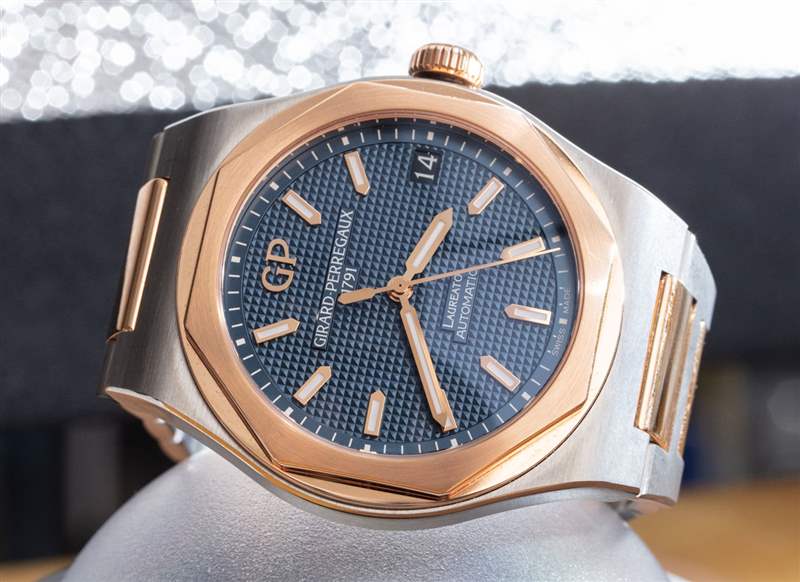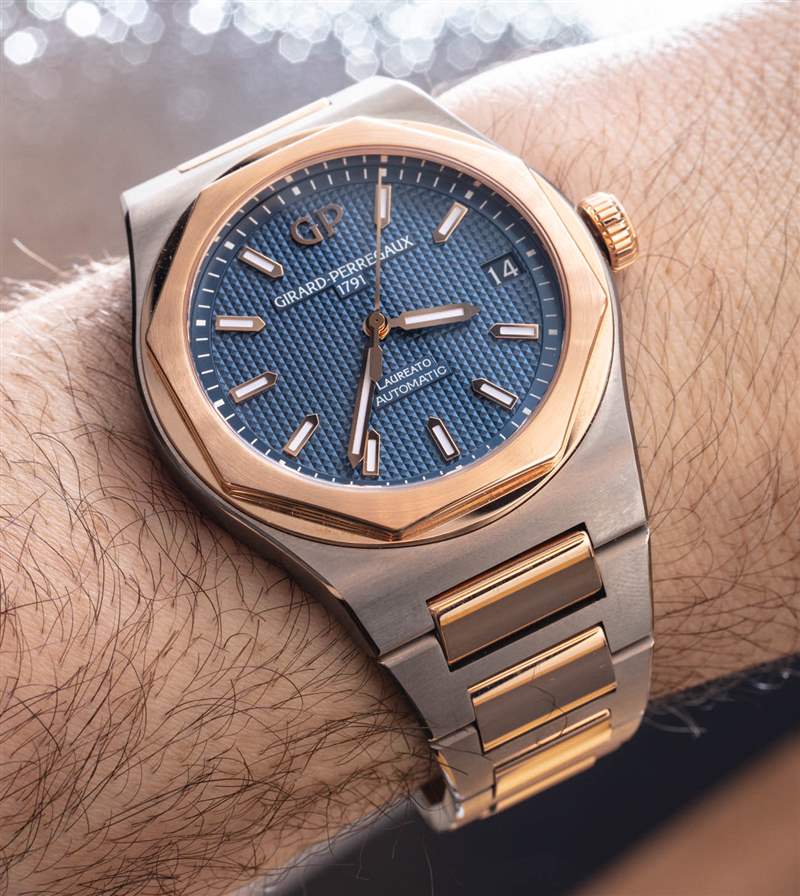 aBlogtoWatch 的Zach Pina 在 2018 年回顧了這款 42 毫米寬的 Girard-Perregaux Laureato 腕表的全鋼版本。然而,這是 Laureato 42 毫米型號 81010-26-232-26A 鈦金屬和 18k 玫瑰金。這款腕表的設計理念是輕巧且稀有的材料組合。它也很昂貴,是同類鋼制手表價格的兩倍。我不是來評論為什么手表要貴得多,但你肯定會是街區里少數擁有手表的孩子之一。因此,如果您想在越來越受歡迎的手表類別領域獲得稀有,請購買鈦和金的東西,而不是鋼。