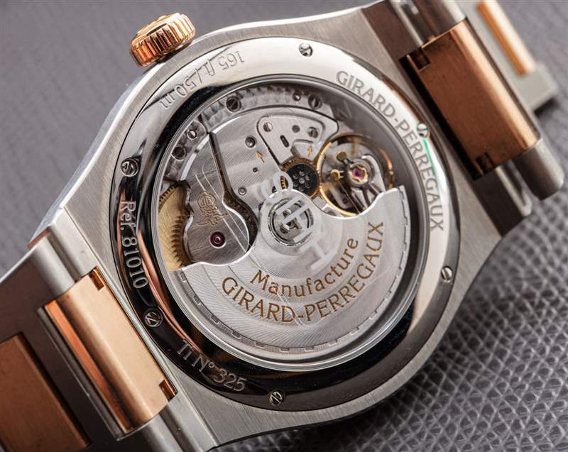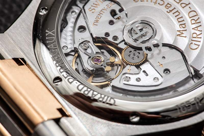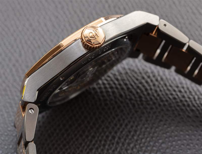 我很喜歡 Girard-Perregaux 能夠制造出仍然使用傳統金屬材料的非常輕巧的手表。也就是說,我確實覺得對于這個價位,該品牌應該更慷慨地使用黃金。例如,手鐲中的中心鏈節用黃金包裹,而不是完全是金鏈節。同樣,這樣做可能是為了減輕重量,但我不禁覺得大多數消費者實際上更喜歡鏈接完全是純金的。手表上的其他黃金元素包括表圈和表冠。芝柏 (Girard-Perregaux) 制造同樣的 Laureato 42 毫米鈦金和玫瑰金腕表,采用藍色表盤,而不是灰色表盤。