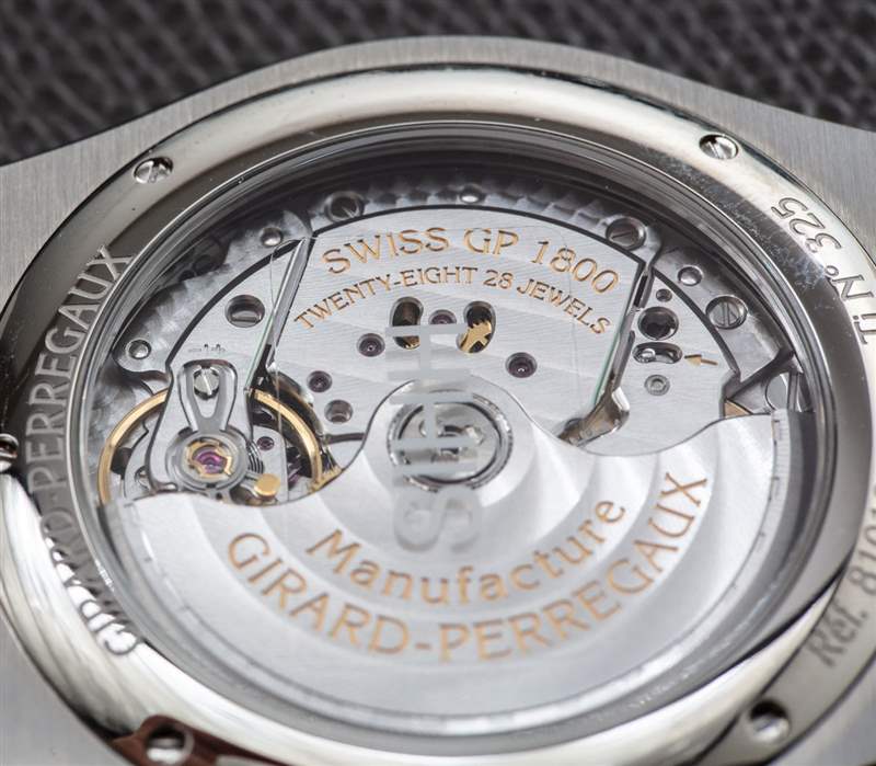 手表內部是內部制造的芝柏口徑GP01800-0012自動機芯。這是一款外觀老式但操作現代的手表,配備自動上鏈機芯,工作頻率為 4Hz(28,800 bpm),動力儲存 54 小時。我必須贊揚 Girard-Perregaux 在漂亮的圓頂底蓋上通過藍寶石水晶提供了特別可愛的機芯視圖。機芯提供時間和日期作為復雜功能。
