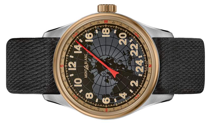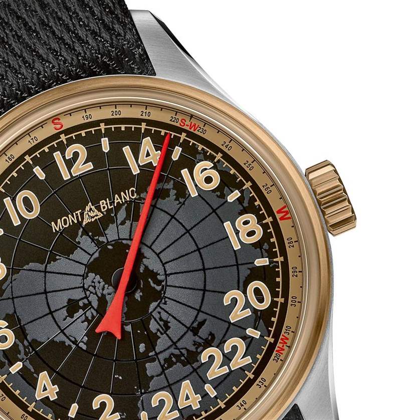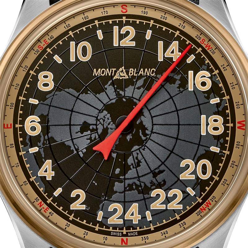 并非所有 24 小時表盤的布局方式都相同。萬寶龍選擇將 12 點鐘位置保持在表盤的頂部位置,因此這一天實際上“開始”,通常是表盤上的 6 點鐘位置。多么有趣的怪癖。表盤本身旨在類似于舊的航空或導航地圖,整個表殼和表盤確實看起來確實像某種理想化的舊儀表表,其大小與磁羅盤和其他此類前電子導航儀器相同。