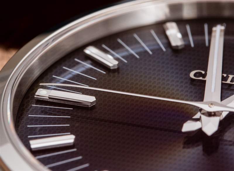 表盤設(shè)計(jì)本身很簡單,如果不是極簡的話。除了 6 點(diǎn)鐘位置的一些小文字外,Calibre 0100 表盤上唯一的文字是應(yīng)用的 Citizen 徽標(biāo)。大部分表盤專門用于鉆石拋光(也有拉絲部分)指針和匹配的時(shí)標(biāo)。它們超平坦的拋光表面反射光線,帶來奢華感,但不會模糊光線,這會妨礙易讀性。表盤也有薄的、印刷的第二個(gè)指標(biāo),幾乎沒有別的。然而,表盤并非沒有細(xì)節(jié)。