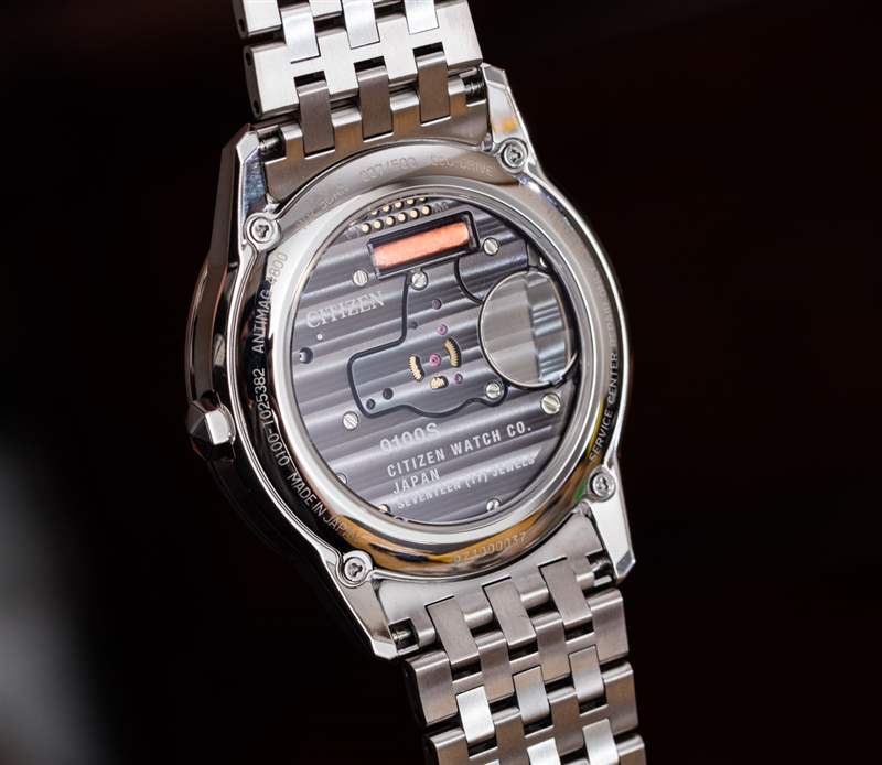 Calibre 0100 本質(zhì)上類似于典型的石英機(jī)芯,但使用了類固醇。它也恰好依靠更強(qiáng)大的系統(tǒng)來解決問題,同時(shí)依靠僅通過光不斷充電的電池汲取電力。Calibre 0100 可能是所有 Citizen Eco-Drive 機(jī)芯的最大成就,因?yàn)樗鼮楦哳l石英機(jī)芯提供了足夠的動力。這怎么可能對我來說是一個(gè)謎,公民可以理解地保持密切。